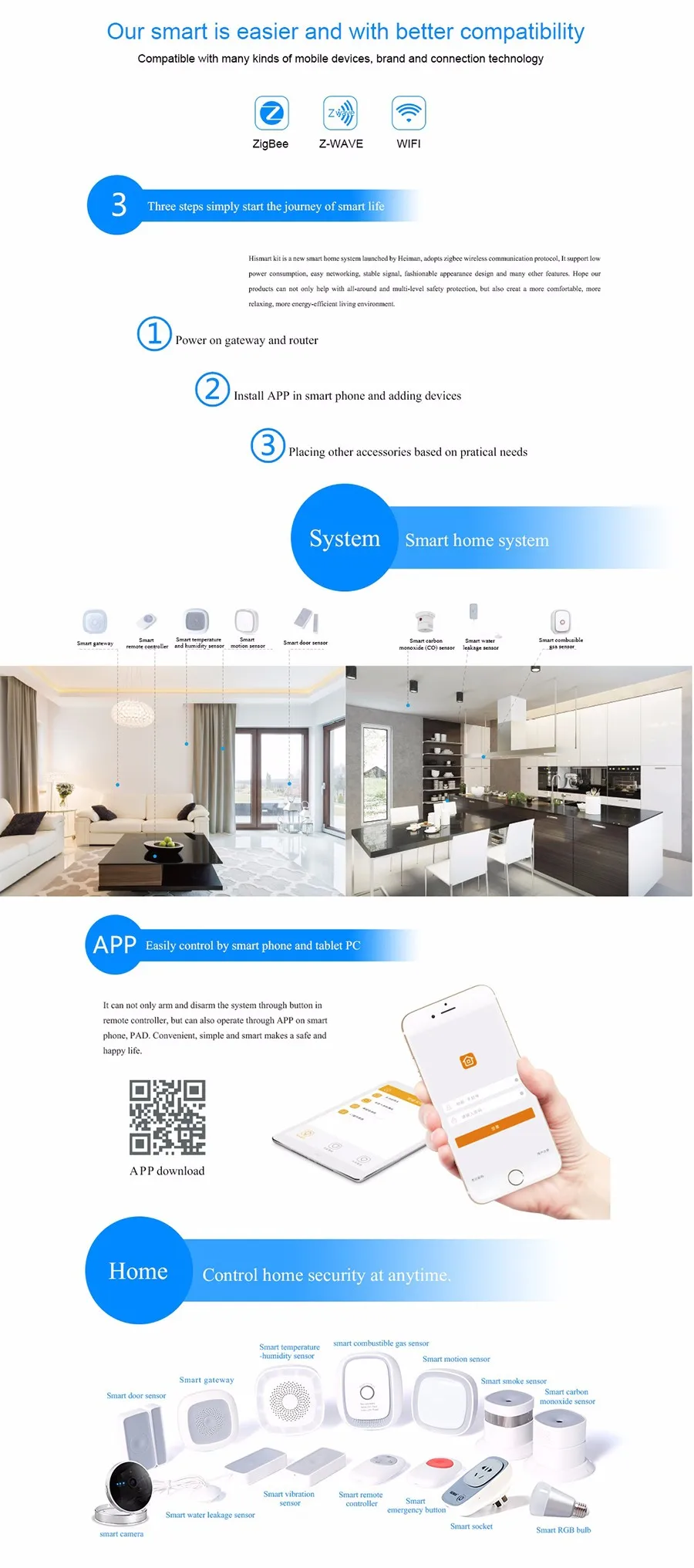 2. All our Zigbee products adopt Zigbe HA1.2 standard protocol, work with most Zigbee hubs,Like smartThings, Zipato