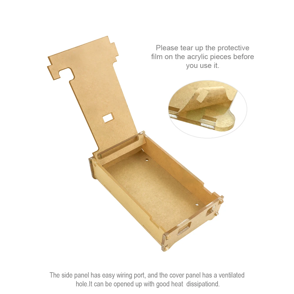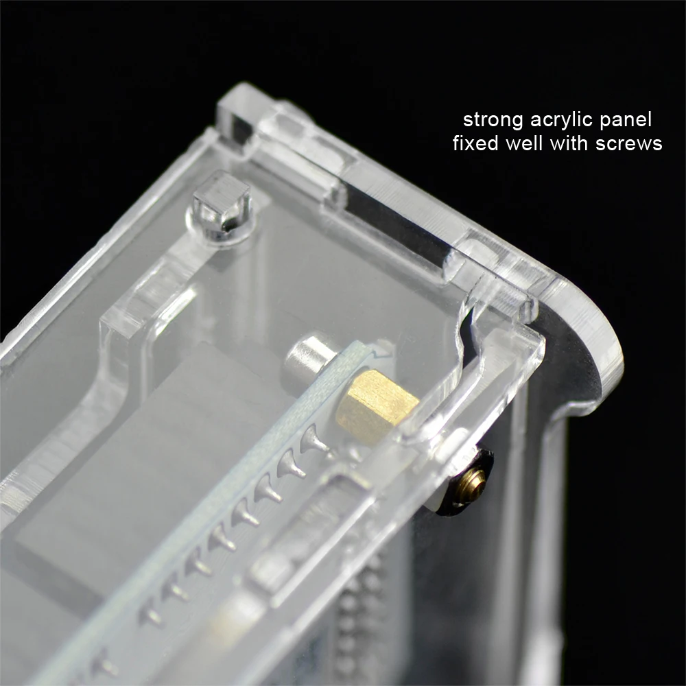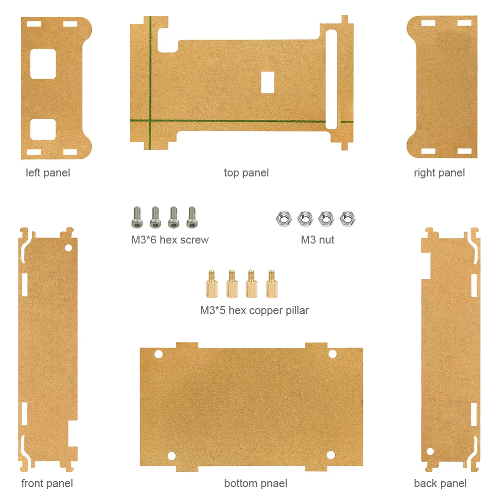 It is acrylic material, and consists of 6 pieces of acrylic panel, 4 hex screws, 4 single-pass copper pillar and 4 nuts. The whole case has light weight and adopts detachable package for safe transport.