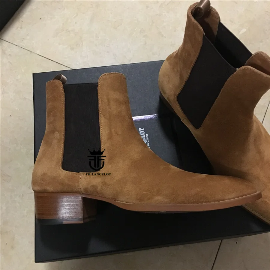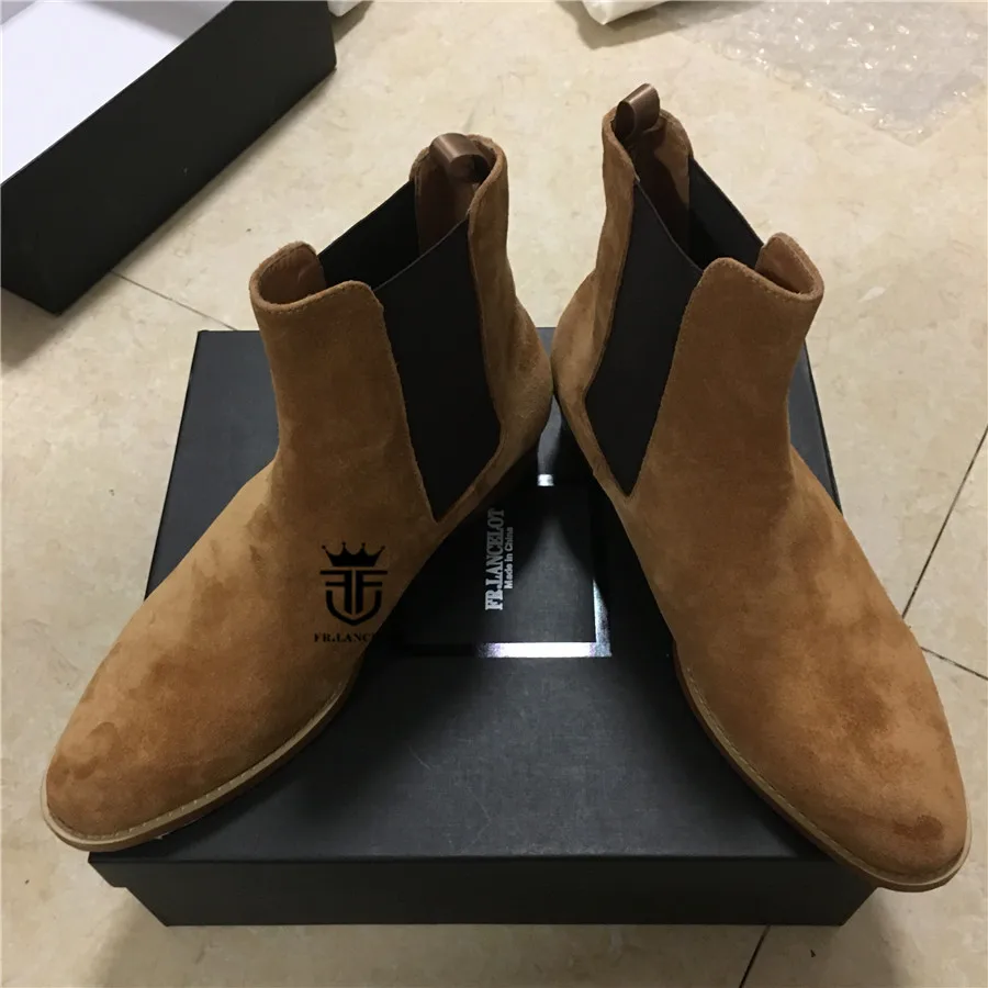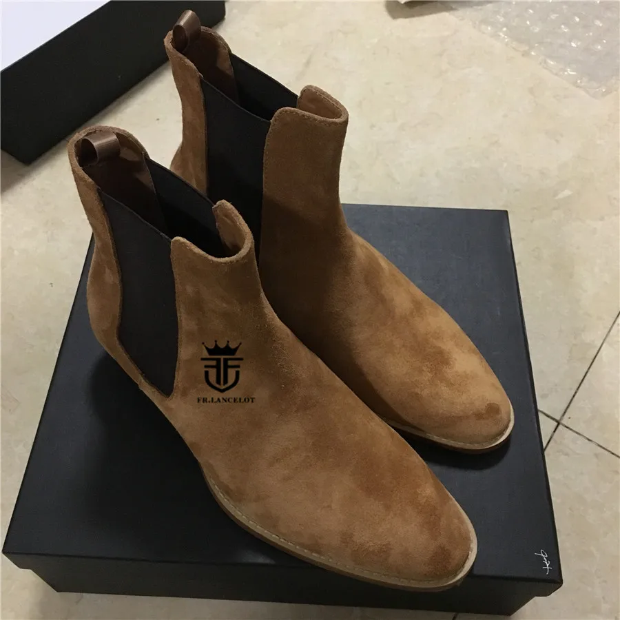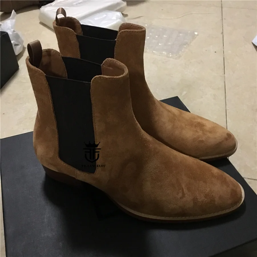 High End Handmade Luxury Slim Slip On Brown Chelsea Men Boots Point Toed Wedge Comfortable Causal Denim Boots