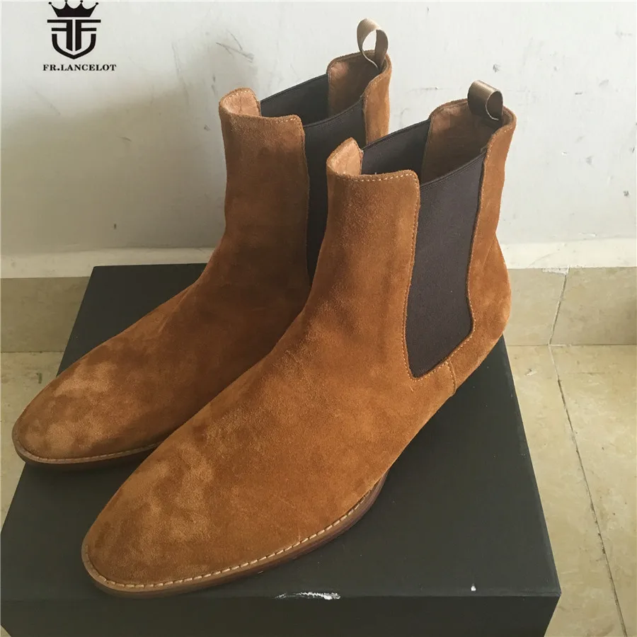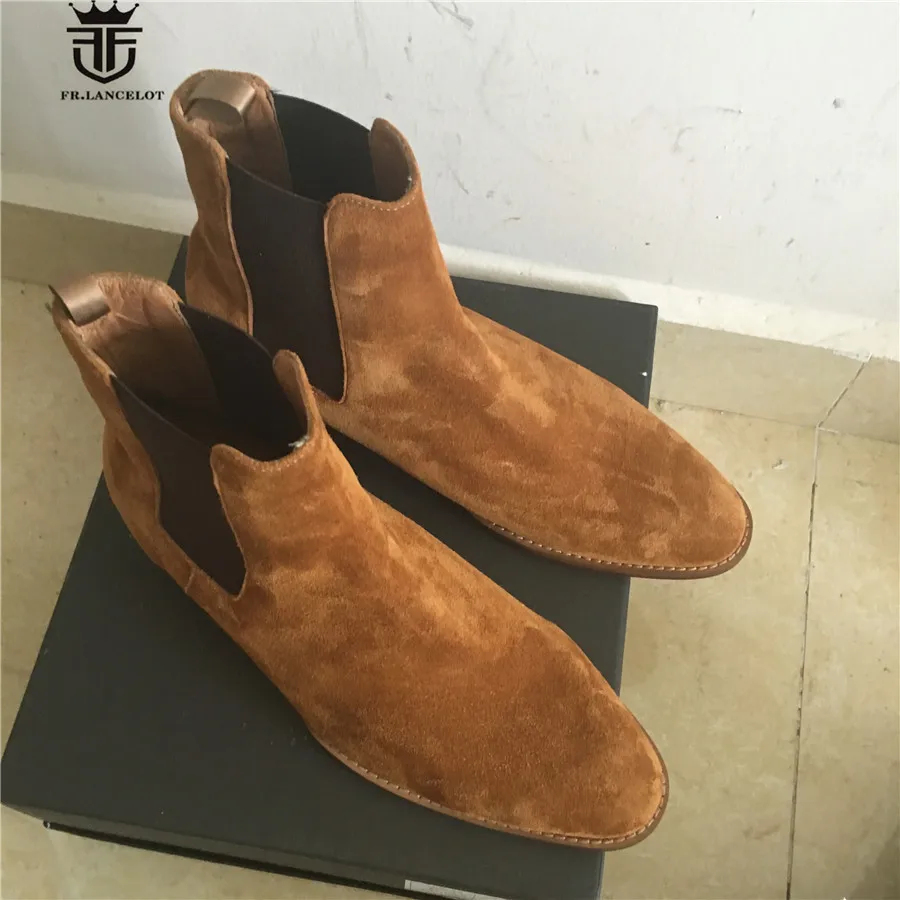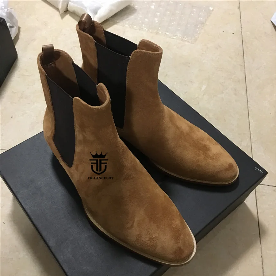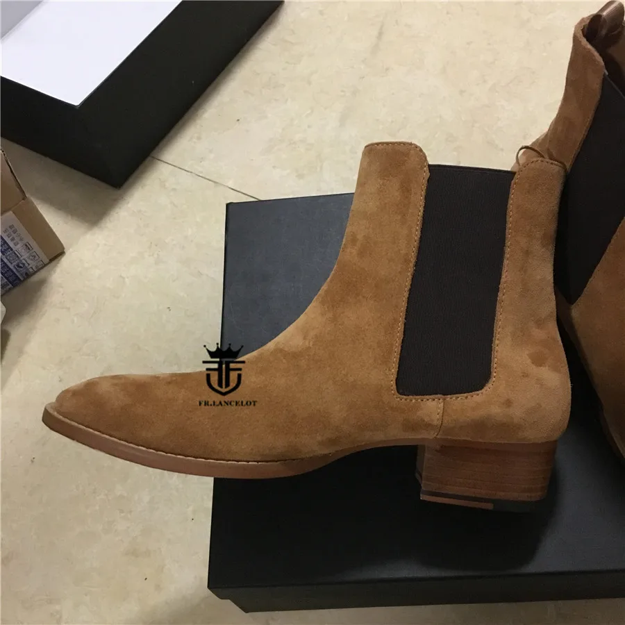 High End Handmade Luxury Slim Slip On Brown Chelsea Men Boots Point Toed Wedge Comfortable Causal Denim Boots