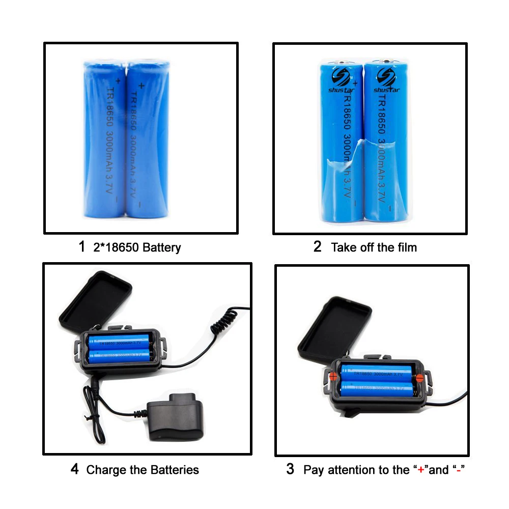 1: 2 x 18650 battery 2: Take off the film 3: Pay attention to the “+” and “-” 4: Charge the batteries