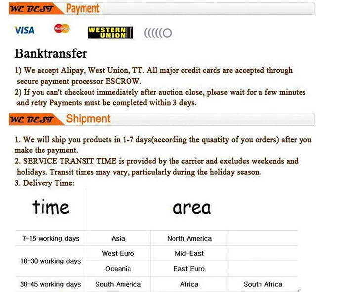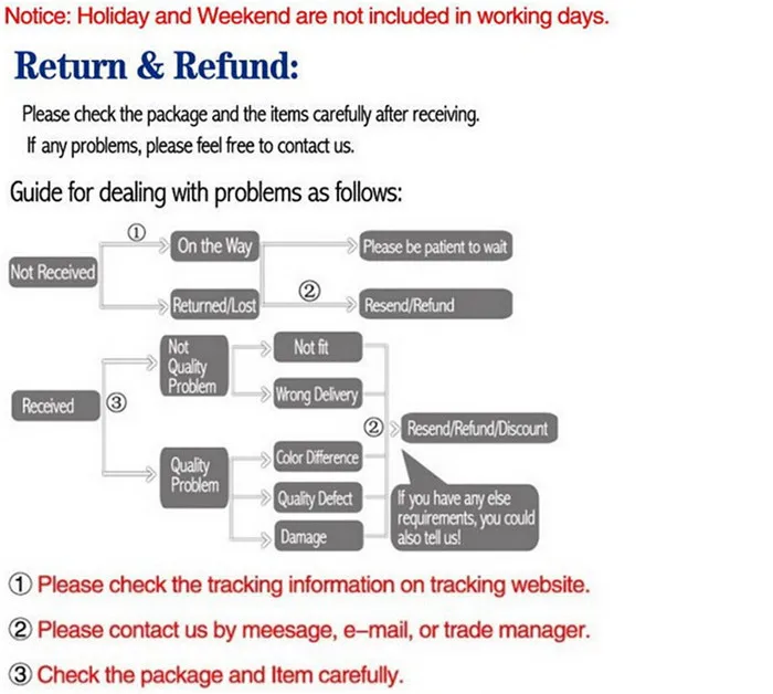 • If you did not receive the product within the guaranteed time( 45 days not including 2-5 day processing) you can request a refund or a reshipment.
