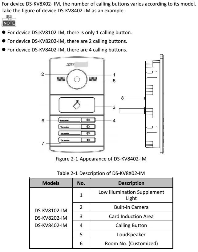 Cabin bottom box, IC card entrance guard read head, 1.3 million pixels wide dynamic 120 ° wide Angle lens Single button the door machine, the machine can achieve the call more indoor machine model, or more than the door machine call many sets of indoor machine model, support the door machine directly authorized user card, call captured images, control of electric locks the door machine support. Can be added to the hik NVR video directly