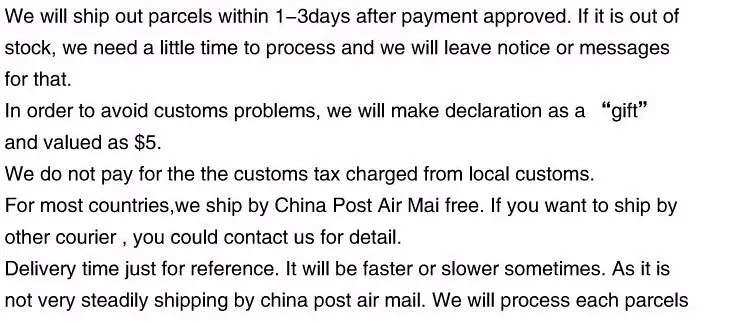 We are not responsible for any custom fees once the items have shipped. By purchasing our products, you consent that one or more packages may be shipped to you and may get custom fees when they arrive in your country.