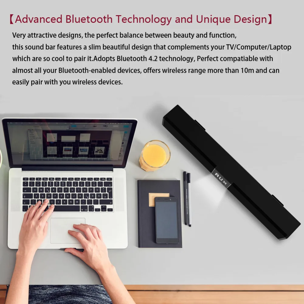 Very attractive designs, the perfect balance between beauty and function, this sound bar features a slim beautiful design that complements your TV/Computer/Laptop which are so cool to pair it.Adopts Bluetooth 4.2 technology, supports almost all Bluetooth-enabled devices, offers wireless range more than 10m and can easily pair with you wireless devices.