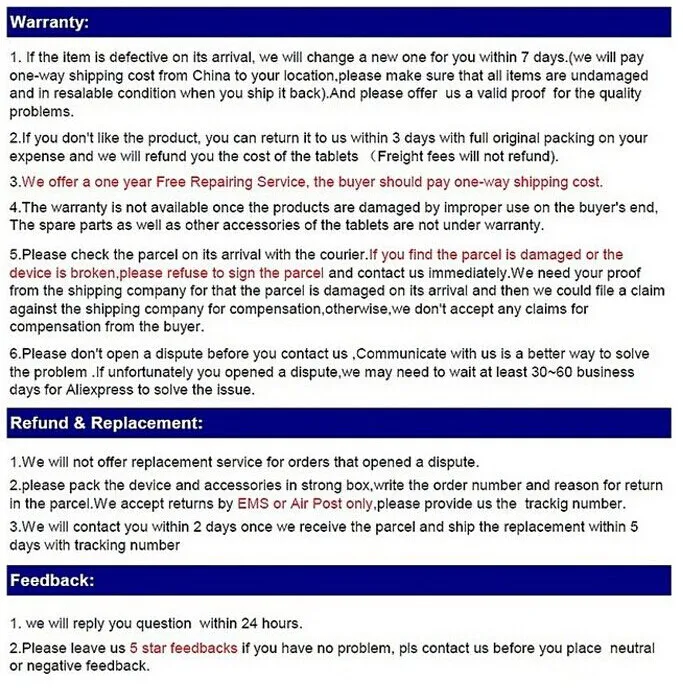 • If you did not receive the product within the guaranteed time( 45 days not including 2-5 day processing) you can request a refund or a reshipment.