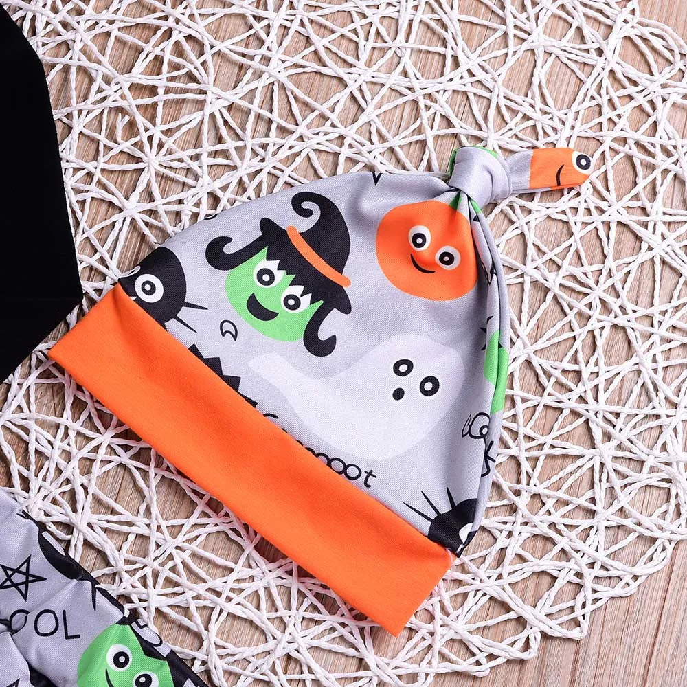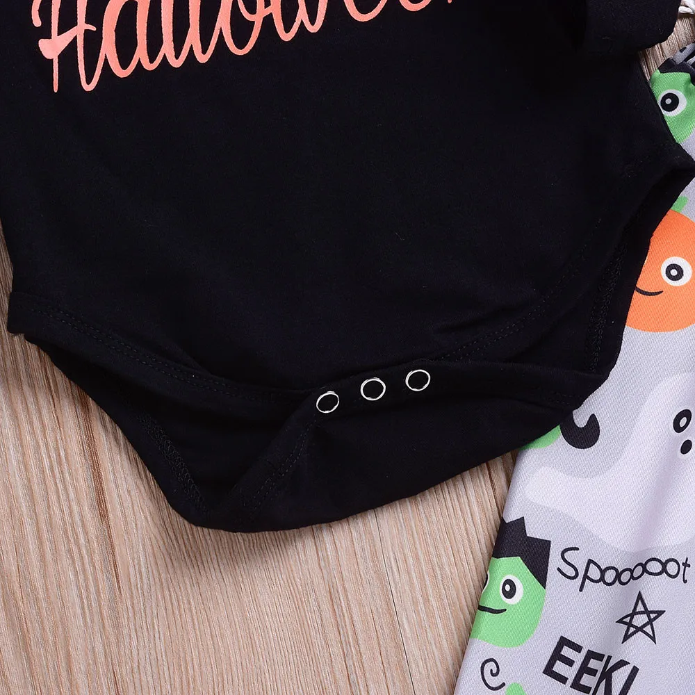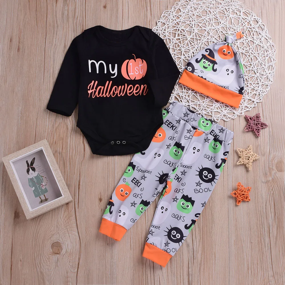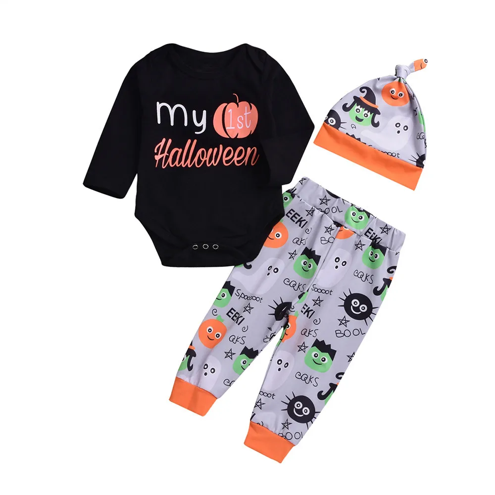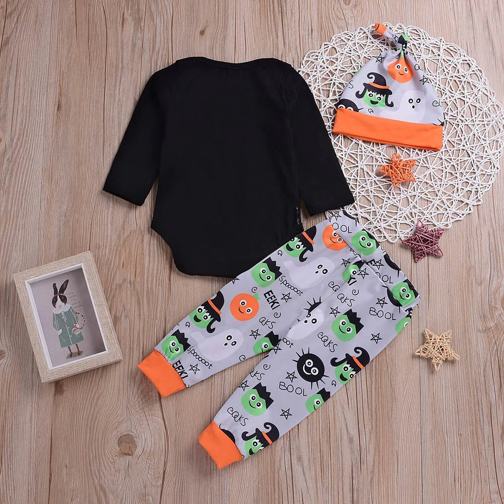Hot Sale Children Clothing Set Long Sleeve O-neck Cotton Halloween Kids Letter Print Romper+Cartoon Print Pants+Hat Clothes Set