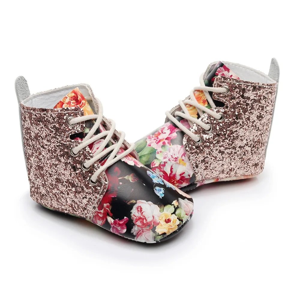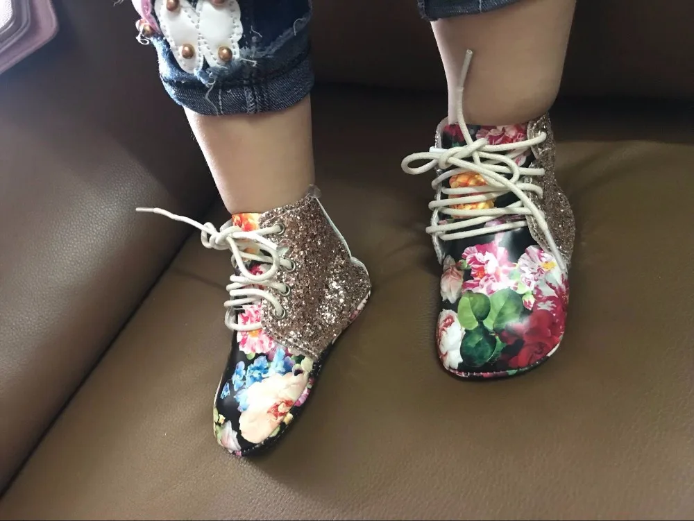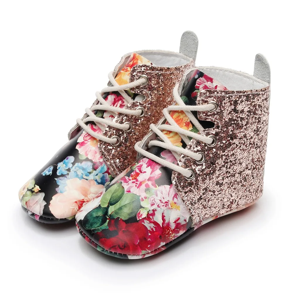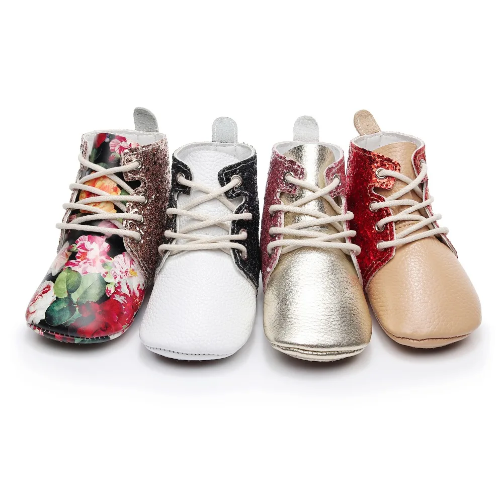 Hot Sale flower printing designer soft rubber bottom baby Shoes Toddler moccasins lace up Newborn Baby Classic booties