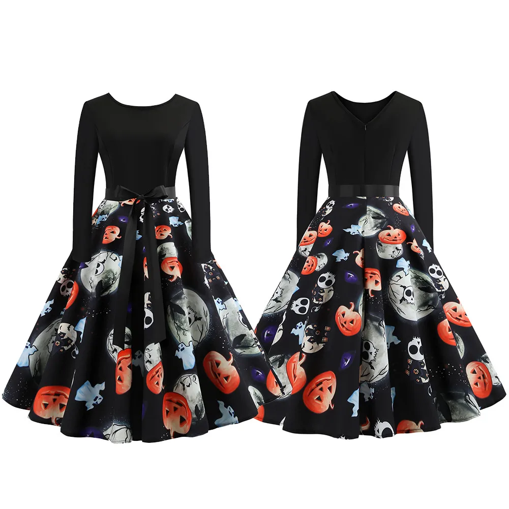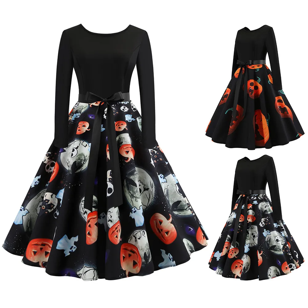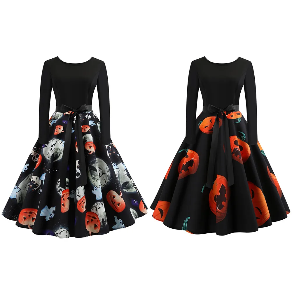 Hot Sale Vintage Women 20178 Halloween Pumpkin Head Vintage Printing Long Sleeve Flare Dress