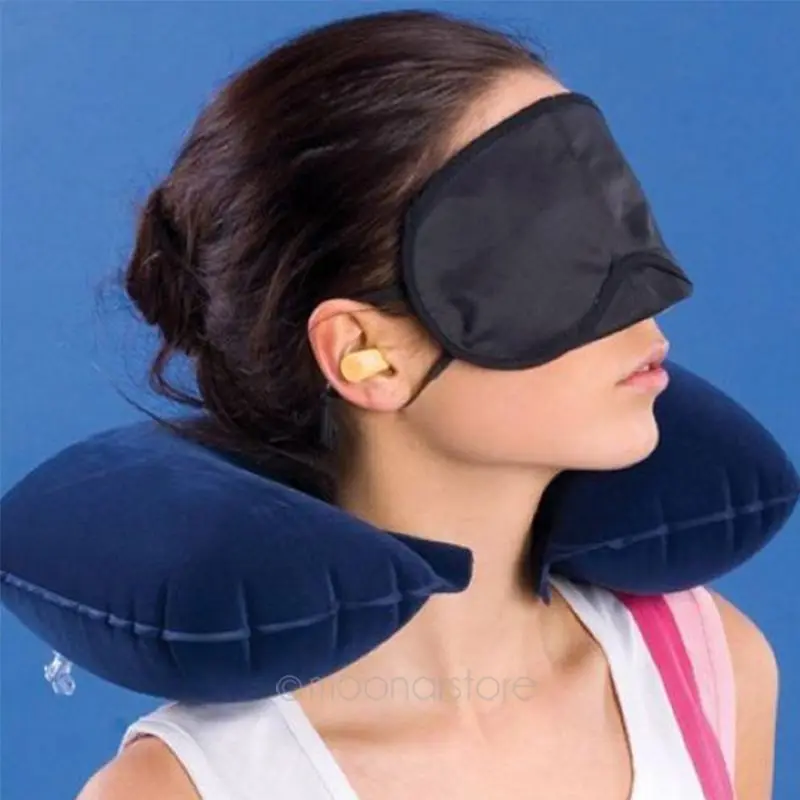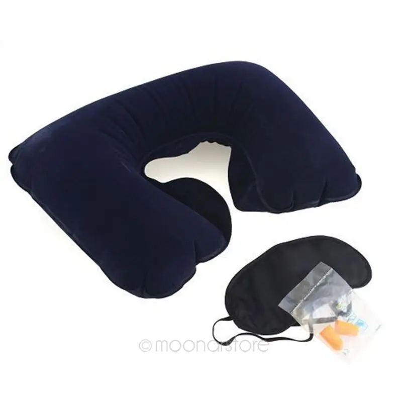 Practical Useful 3 in 1 Business Trip Travel Set Inflatable Neck Air Cushion Pillow + Eye Mask + 2 Ear Plugs Easy Carrying