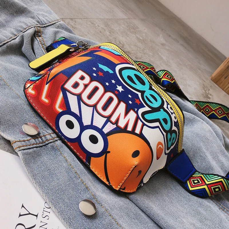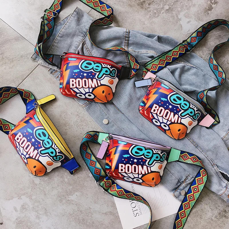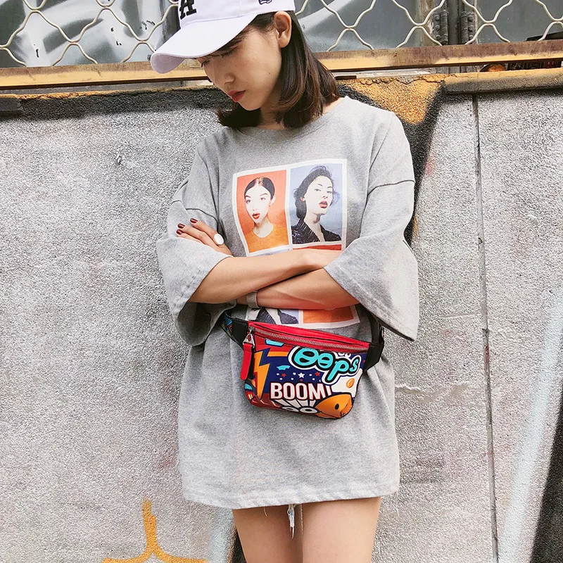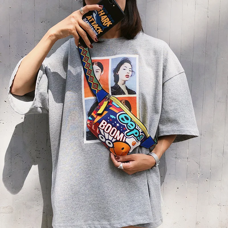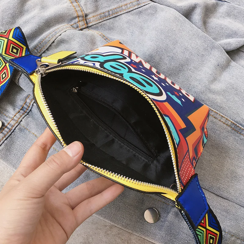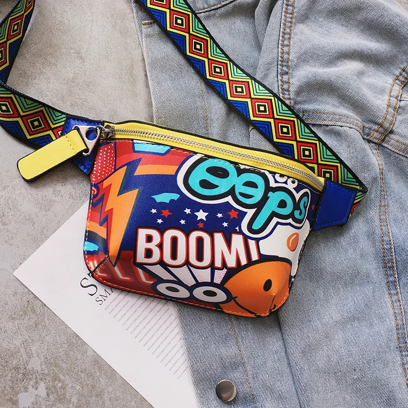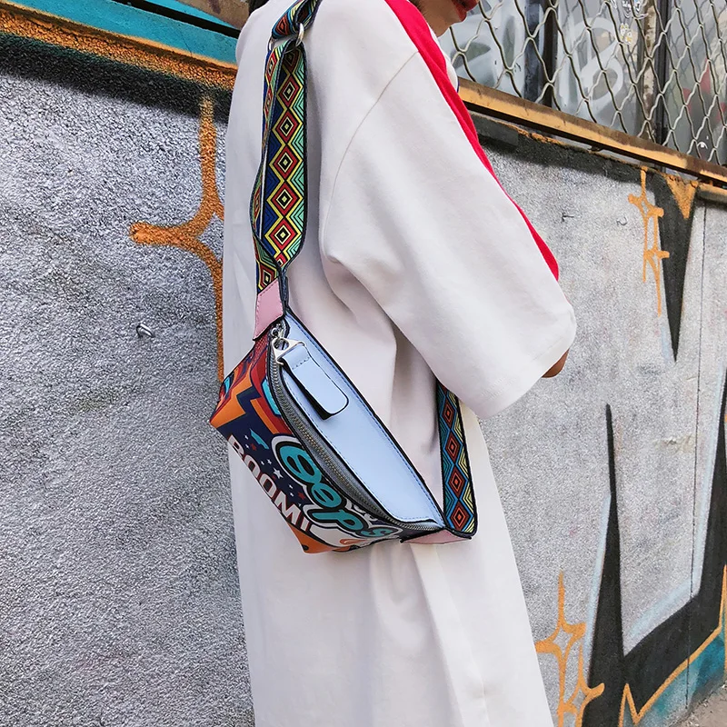HTNBO Fanny Pack Waist Bag Women Personality Belt Bags PU Leather Graffiti Chest Handbag WIth Colorful Shoulder Belt 2018