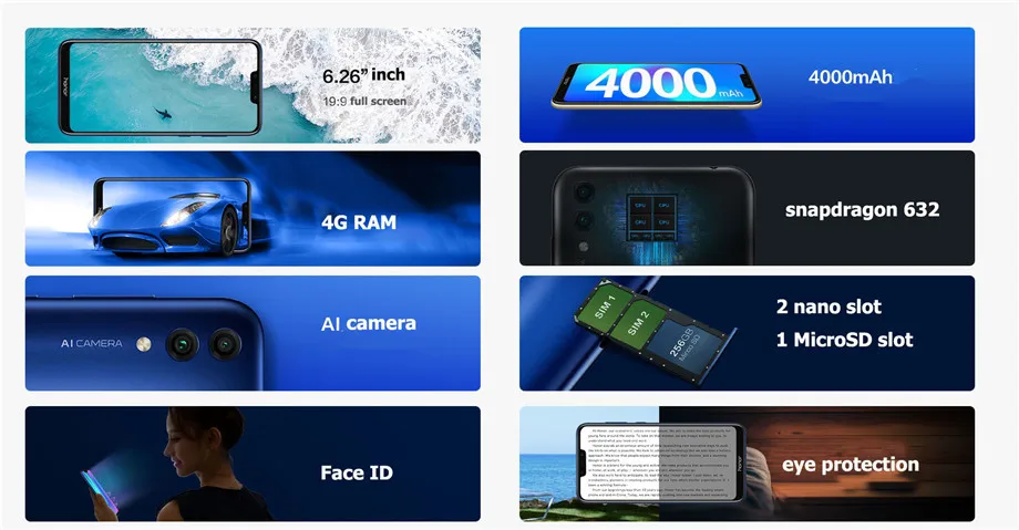 6.26 inch TFT LCD(IPS)Full Screen HD+ 1520×720 Pixel 10 point touch 269 PPI