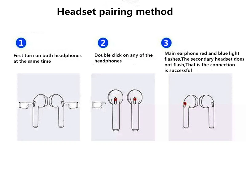Pairing mode: long press the blue light flashing is the normal pairing mode. After booting, do not release and continue to press for three seconds until the blue light flashes rapidly. At this time, the prompting paring, then enter the binaural pairing state. After the binaural pairing is successful, the blue light flashes slowly.Pairing mode: long press the blue light flashing is the normal pairing mode. After booting, do not release and continue to press for three seconds until the blue light flashes rapidly. At this time, the prompting paring, then enter the binaural pairing state. After the binaural pairing is successful, the blue light flashes slowly.