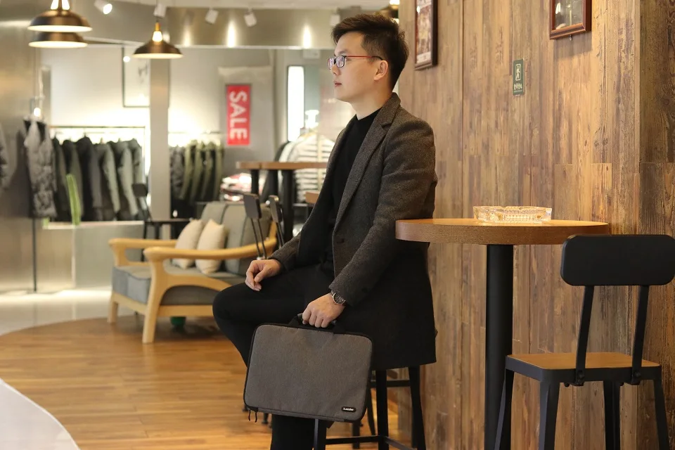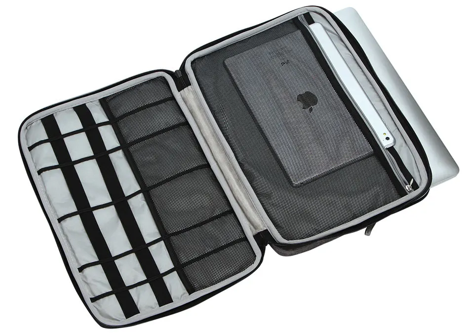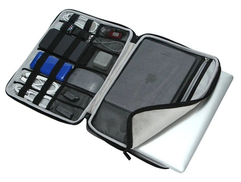 The front has a large zipper pocket and a small pocket.The big one can put in mouse、power supply, etc., the small one can put in headphones, keys or other small objects