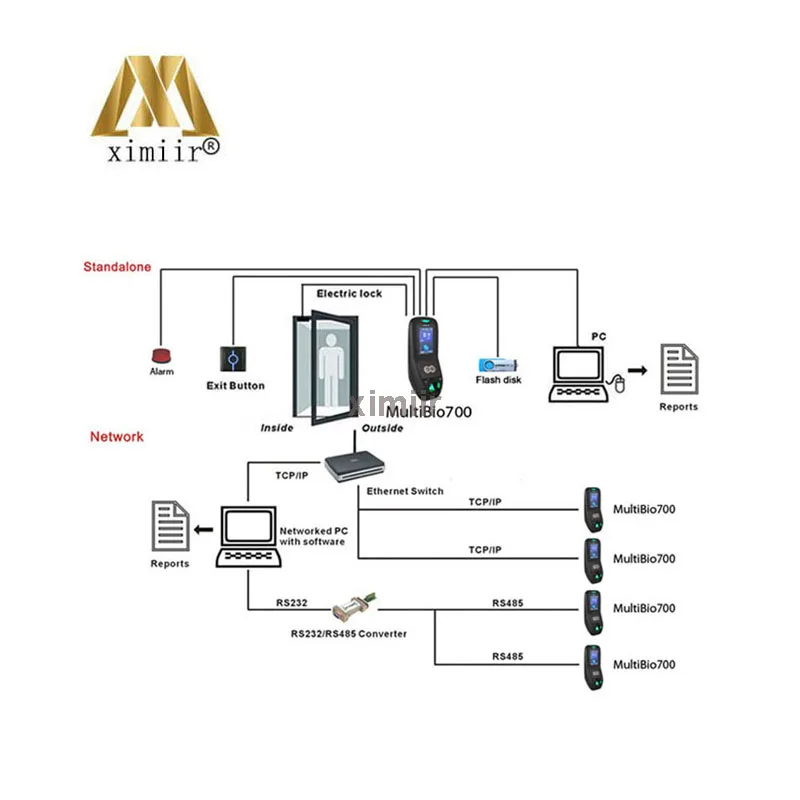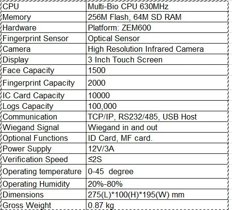 MultiBio 700 is a new generation multiple biometric identification product, standard integrating with Face, Fingerprint, PIN recognition and optional with RFID mode, as to facial identification algorithm, it captures the relative position, size, and shape of user’s eyes, nose, cheekbones, and jaw features, these feature templates are used to be matching feature data, when users verify on device, it distills captured features into value and compares with templates to eliminate variance. MultiBio 700 may hold 1500 faces (optional 3000) without dividing groups, its default identification mode is Fingerprint & Face, additionally, as it is a kind of professional access control facial device, it may work with the third party such as electric lock, alarm, door belling, sensor and so on, in order to improve security for human life and enterprise information.