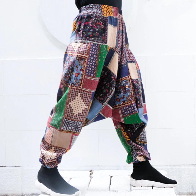 Product Description:Mens Vintage Plus Size Harem Pants Baggy Ethnic Print Elastic Waist Crotch Trousers