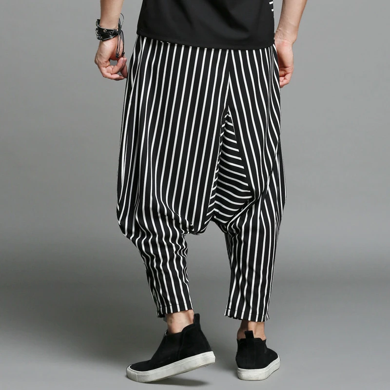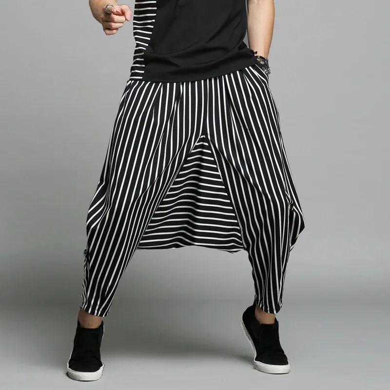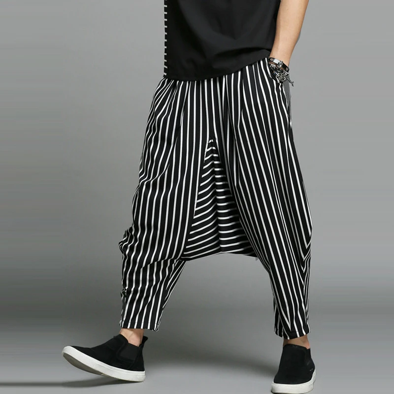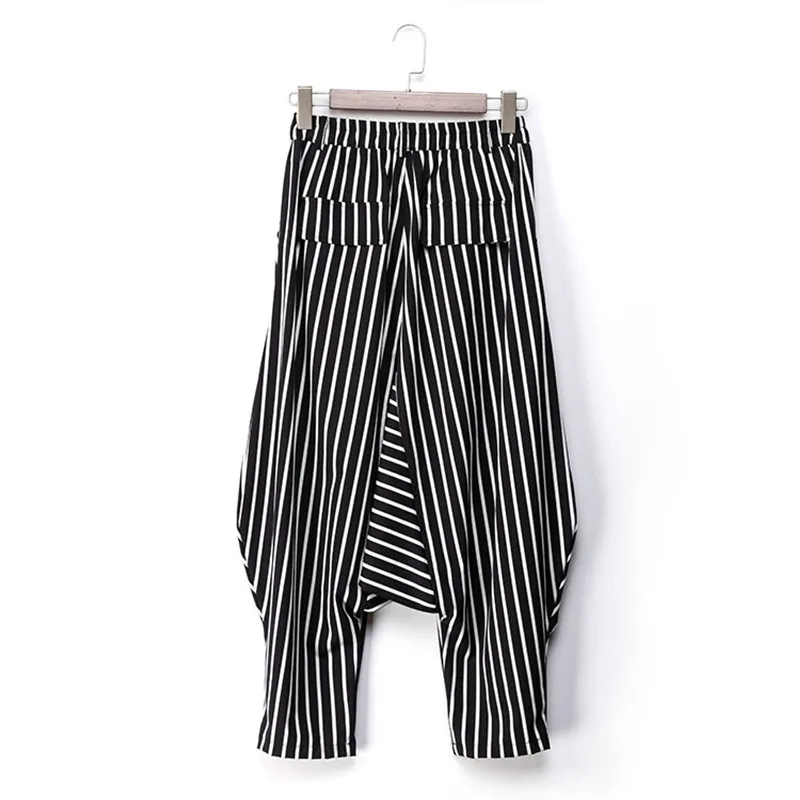 Product Description:Mens Baggy Harem Pants Stripe Loose Wide Leg Casual Crotch Trousers
