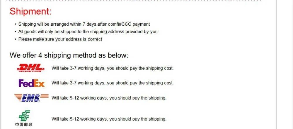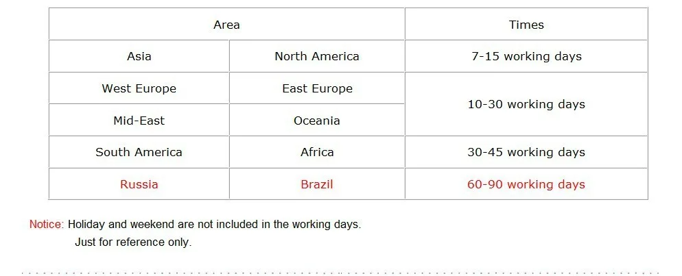 Shipping EMS, UPS, DHL, China air post, China post air mail also supported to Russia,Turkey,Brazil.ect
