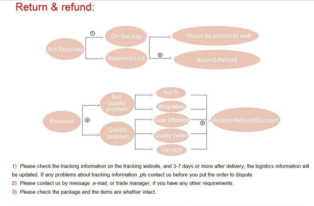 • If you did not receive the product within the guaranteed time( 45 days not including 2-5 day processing) you can request a refund or a reshipment.