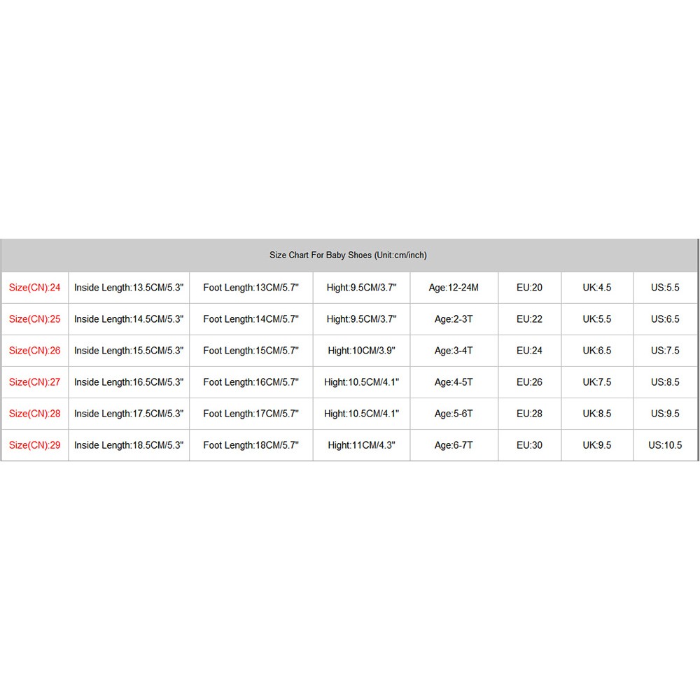 | Size(CN):28 | Inside Length:17.5CM/5.3″ | Foot Length:17CM/5.7″ | Hight:10.5CM/4.1″ | Age:5-6T | EU:28 | US:9.5 | |