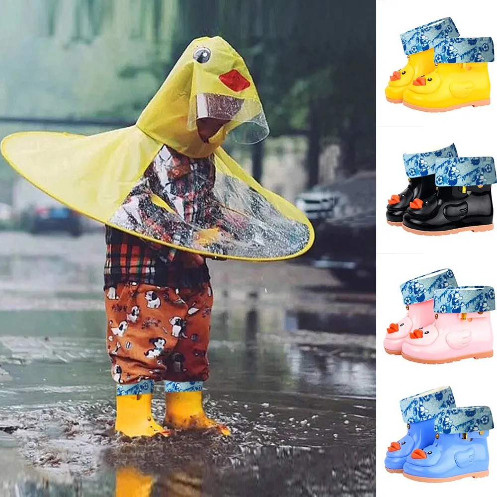 Infant Kids Rain Shoes Children Baby Boys Girls Cartoon Duck Rubber Waterproof Warm Boots Rain Shoes+Umbrella Raincoat
