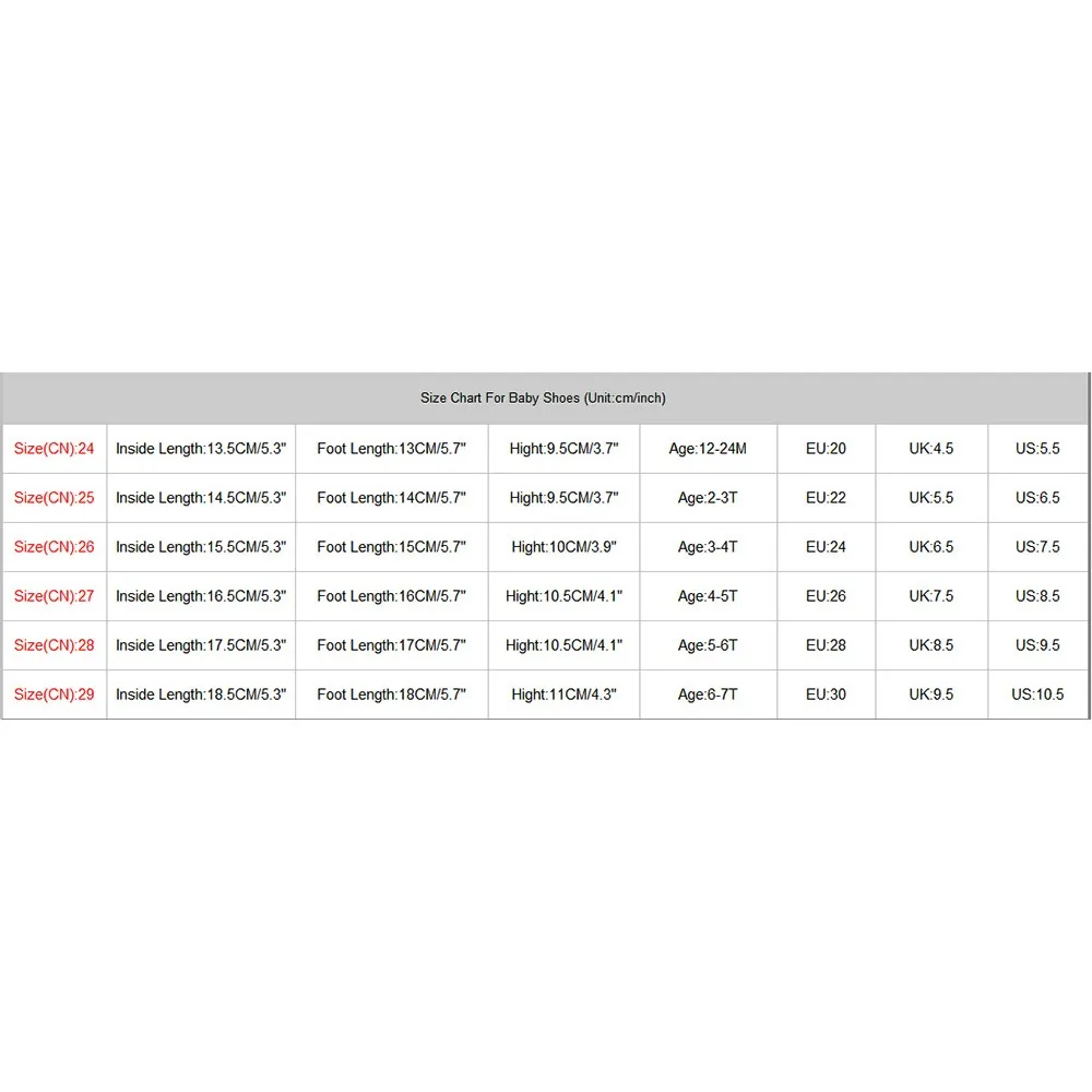 | Size(CN):26 | Inside Length:15.5CM/5.3″ | Foot Length:15CM/5.7″ | Hight:10CM/3.9″ | Age:3-4T | EU:24 | US:7.5 | |