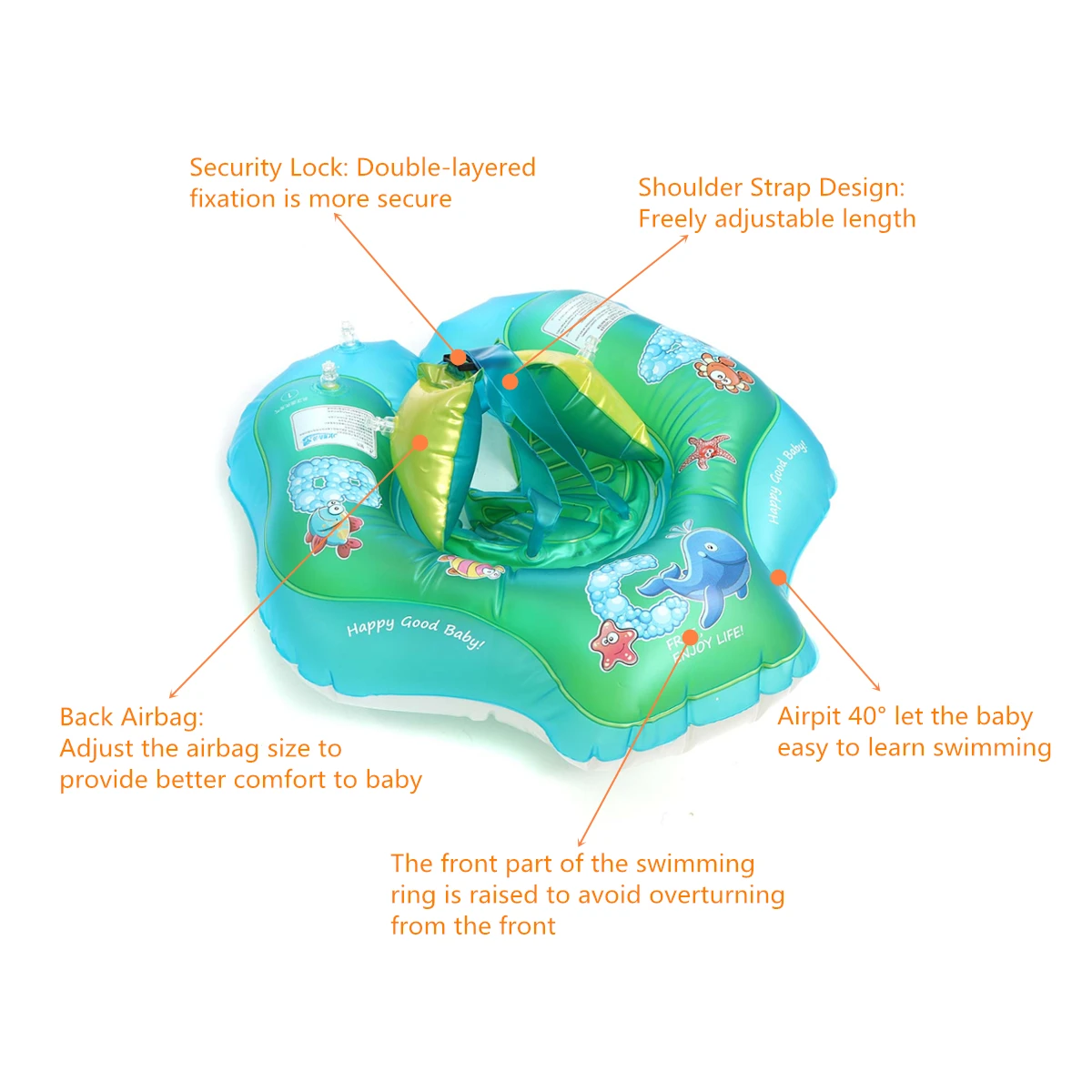 – Perfectly manufactured to fit the body of baby, airpit 40° let the baby easy to learn swimming