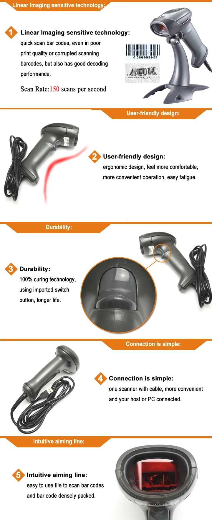 5.Intuitive aiming line: easy to use file to scan bar codes and bar code densely packed.
