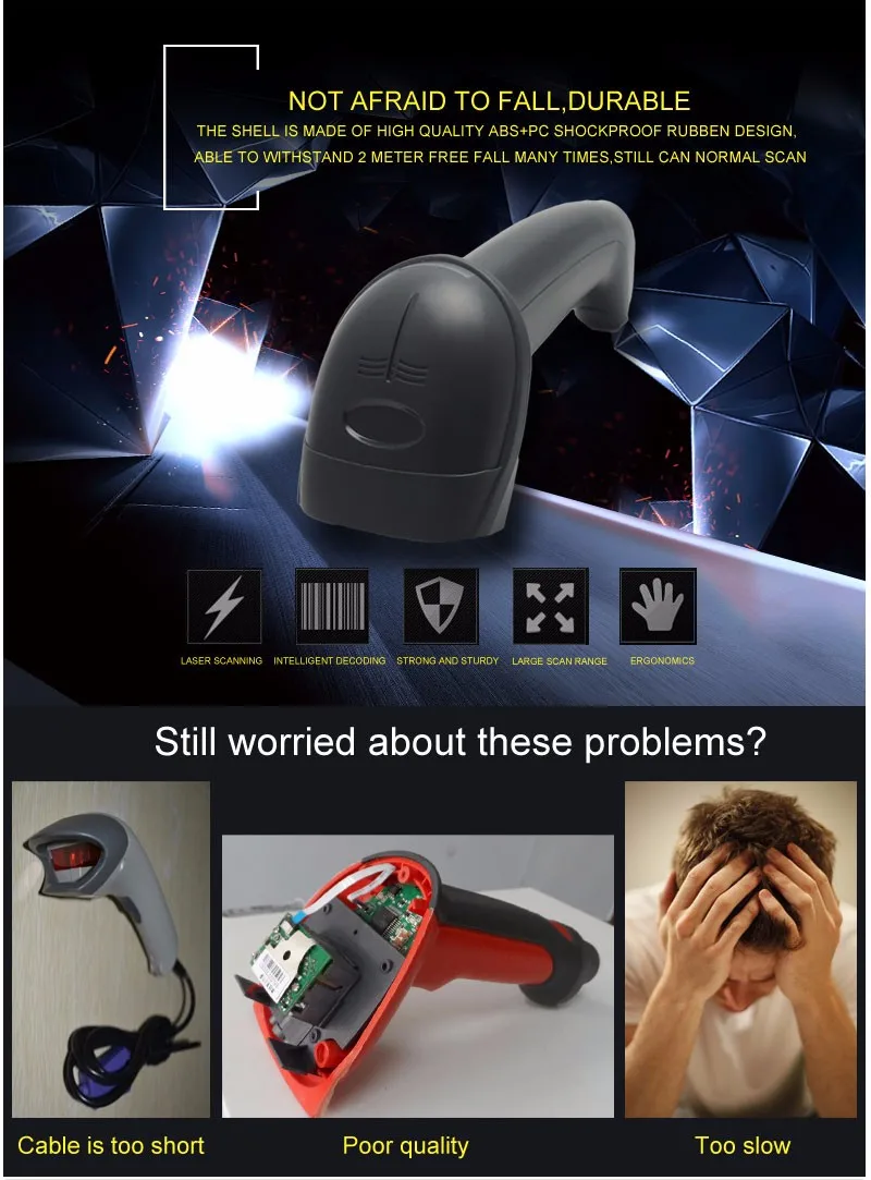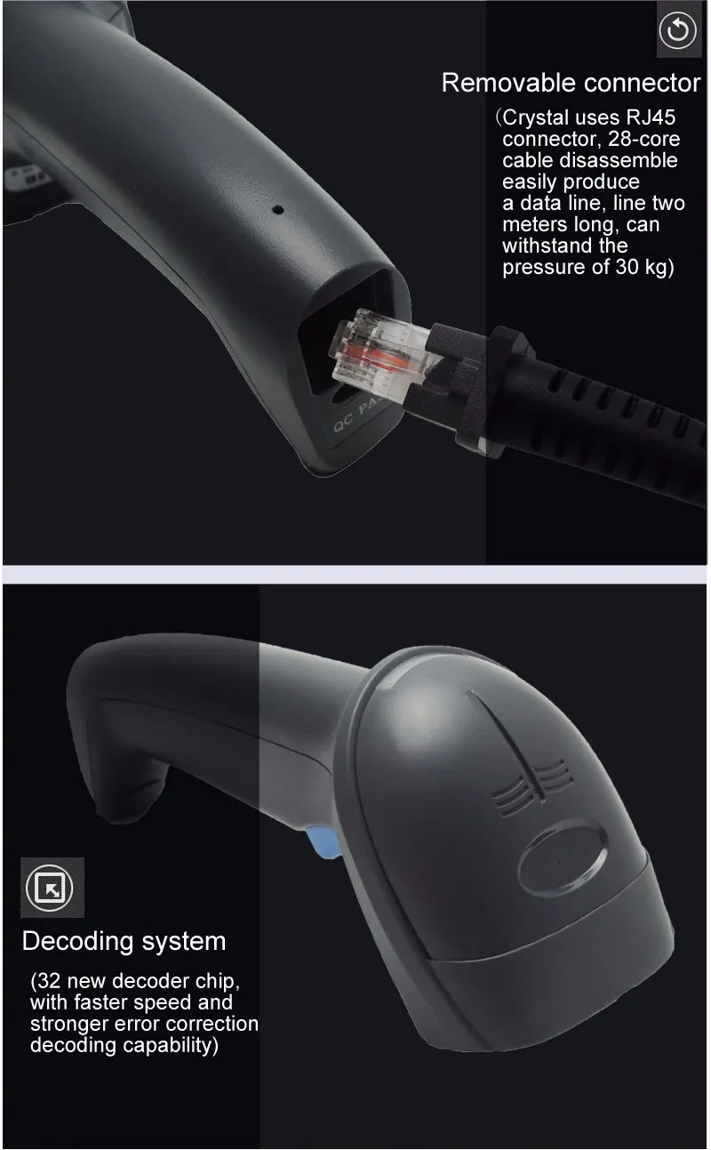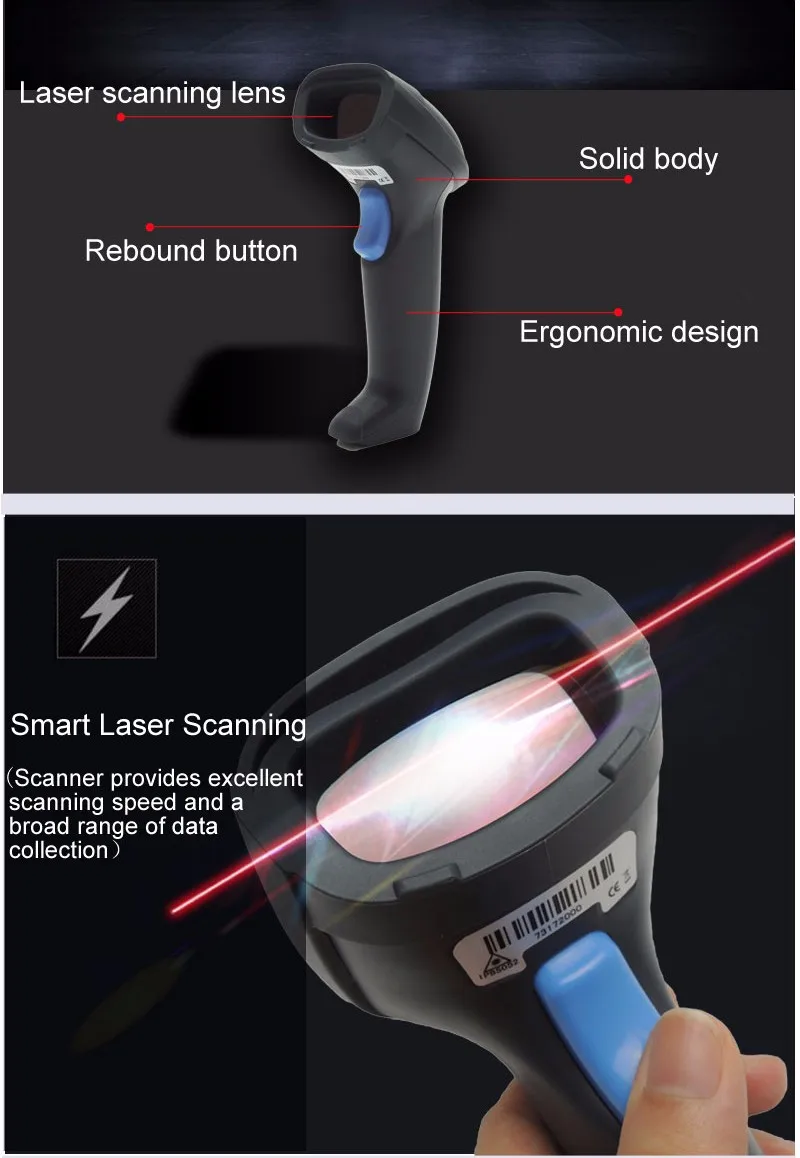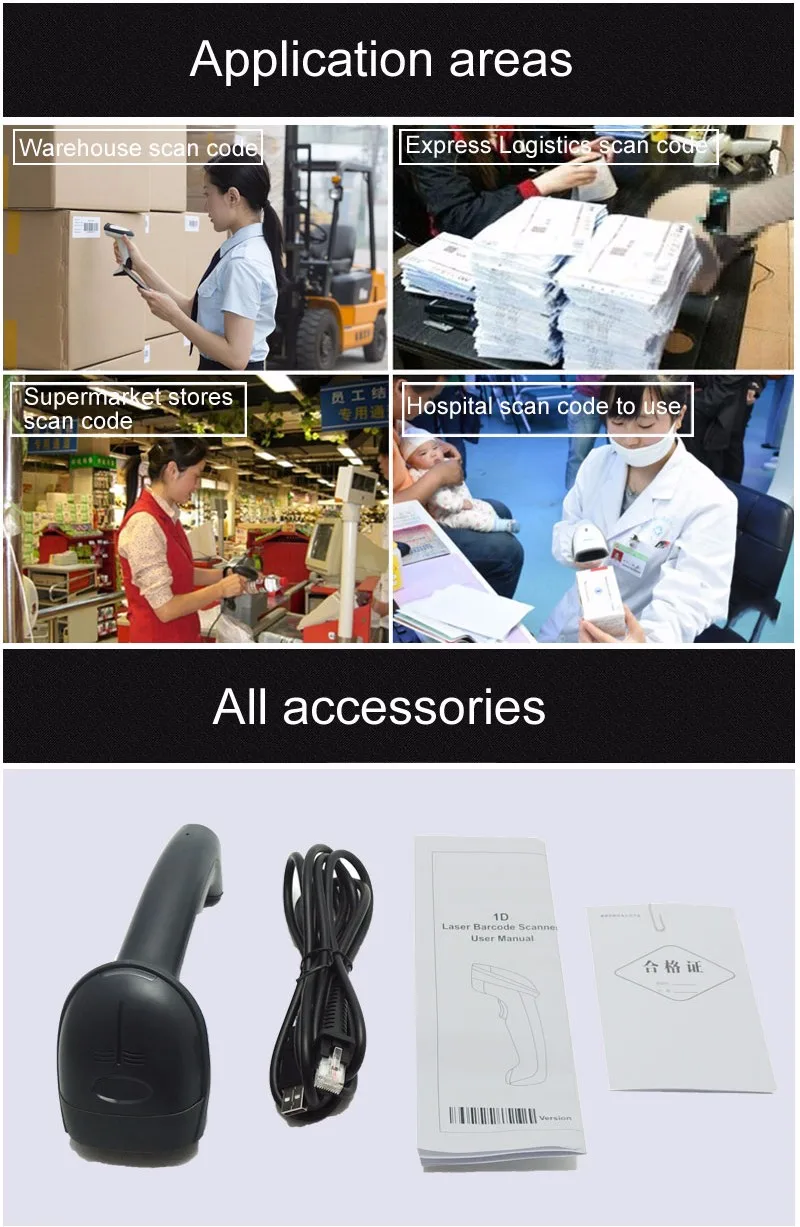 The barcode scanner is USB 1D wired handheld laser scanner. It is used very widely in shopping malls, supermarkets, retail and etc.