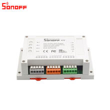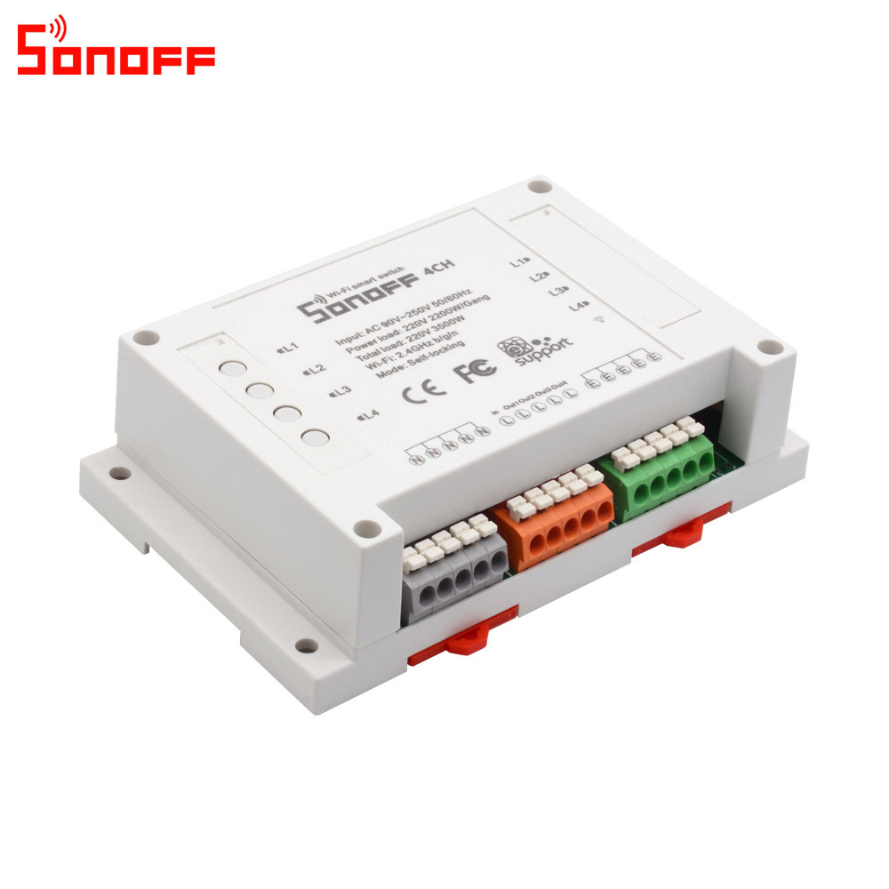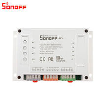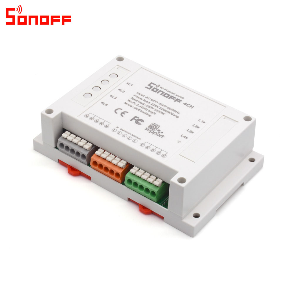 Sonoff 4CH is a 4-gang switch with din rail mounting. Sonoff 4CH 4 gang light switch supports to connect and control 4 electrical appliances,