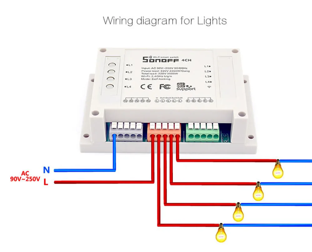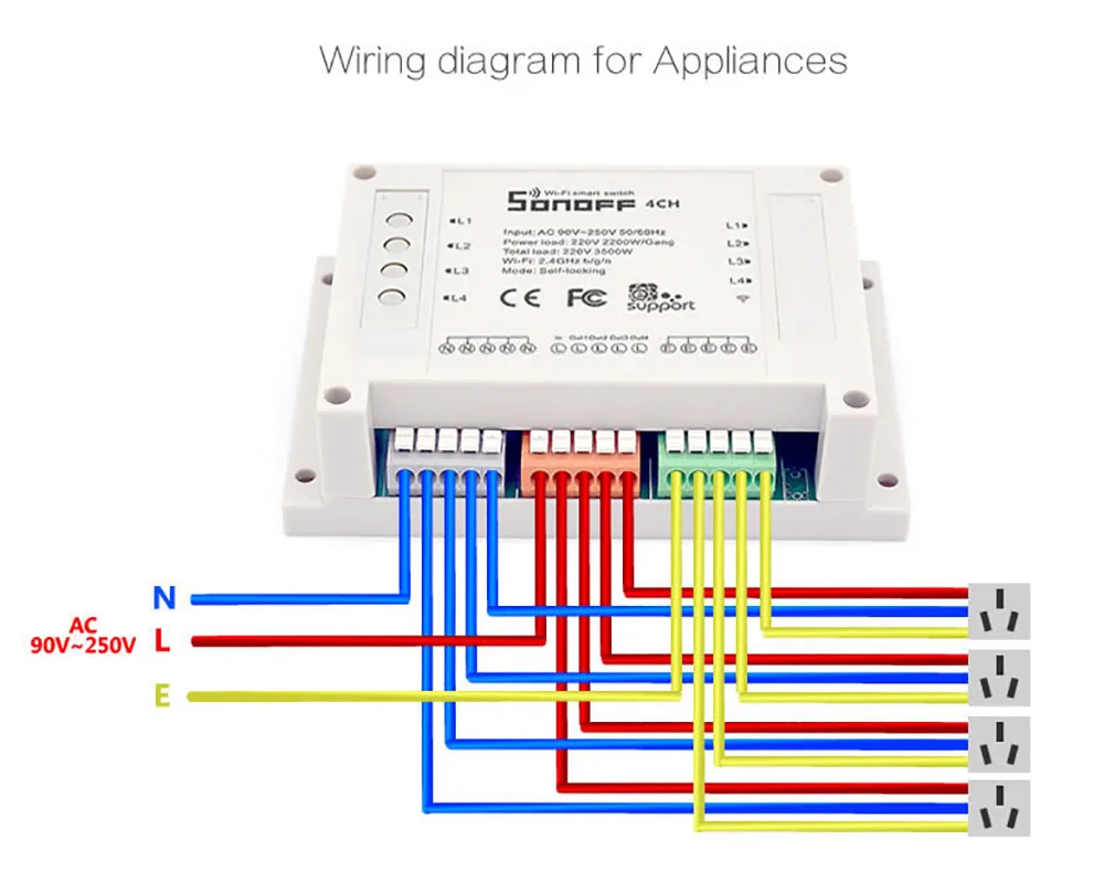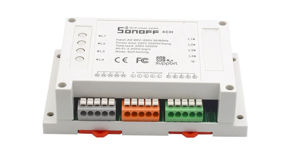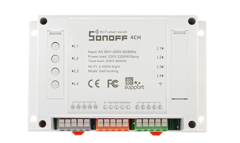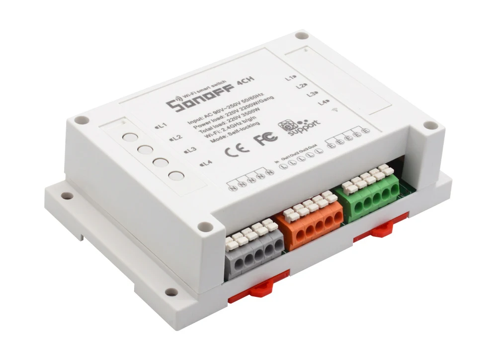 Sonoff 4CH is a 4-gang switch with din rail mounting. Sonoff 4CH 4 gang light switch supports to connect and control 4 electrical appliances,