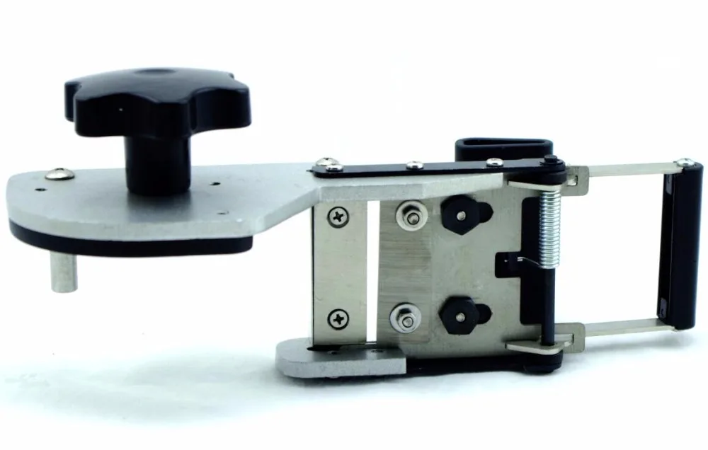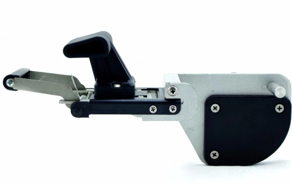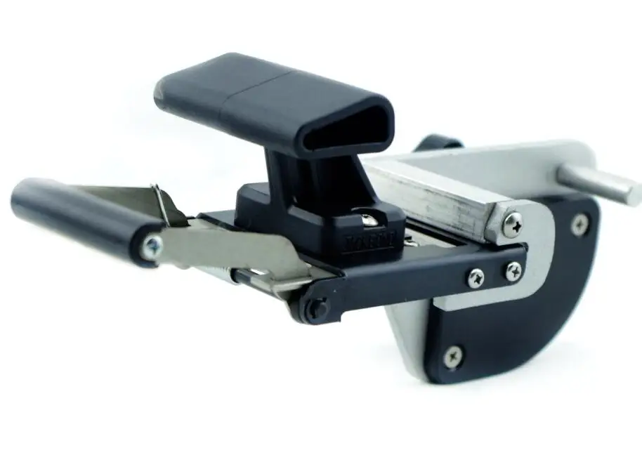 End trimmer for flush cutting of of PVC, melamine, Polyester and veneer tapes and strips of up to 3 mm thick and 55 mm wide. It provides a clean and exact cut, avoiding damage to strips and panels. The 2 blades guillotine system allows cutting the tape with less effort and obtaining a clean cut.