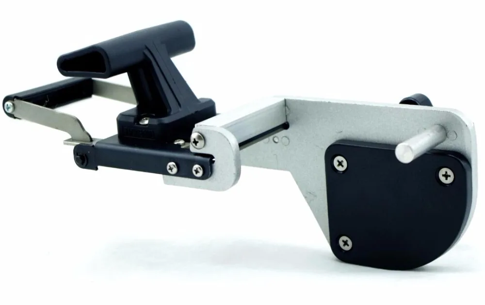End trimmer for flush cutting of of PVC, melamine, Polyester and veneer tapes and strips of up to 3 mm thick and 55 mm wide. It provides a clean and exact cut, avoiding damage to strips and panels. The 2 blades guillotine system allows cutting the tape with less effort and obtaining a clean cut.