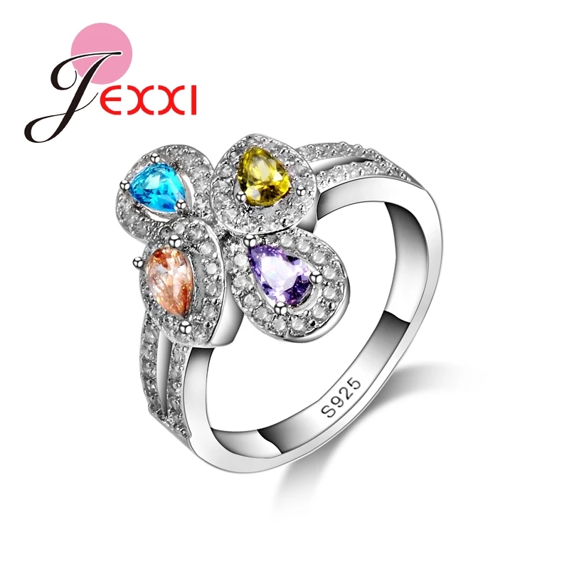 JEXXI Hot Sell!Wholesale 925 Sterling Silver Fashion Ring Finger With Colorful Drop Shape CZ Diamond Rings For Women/Girls