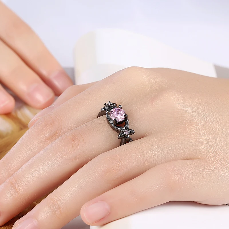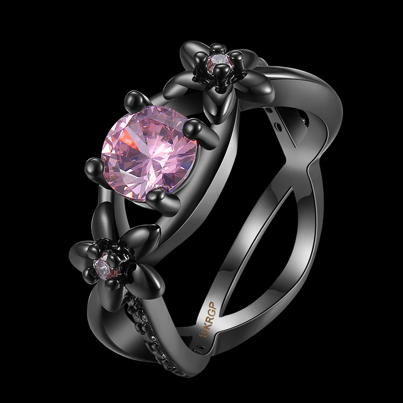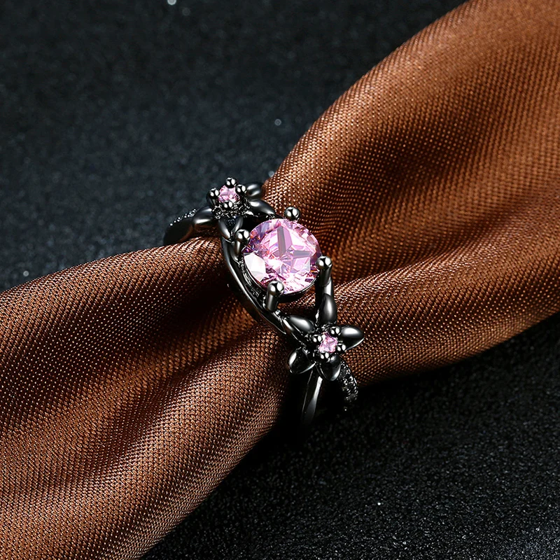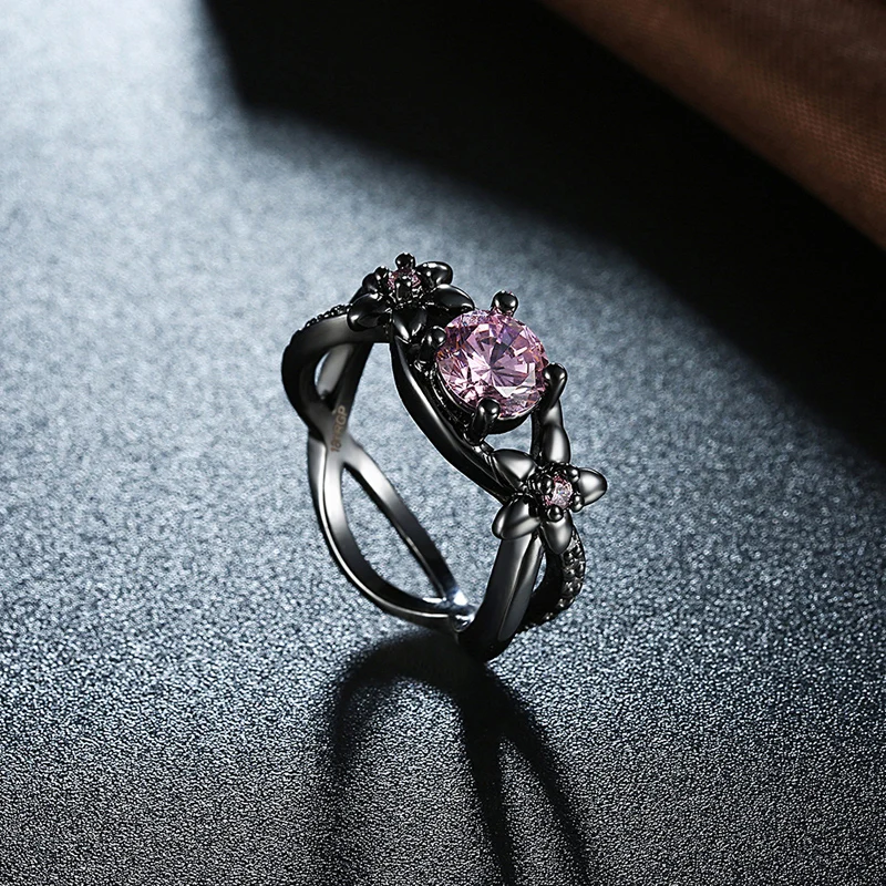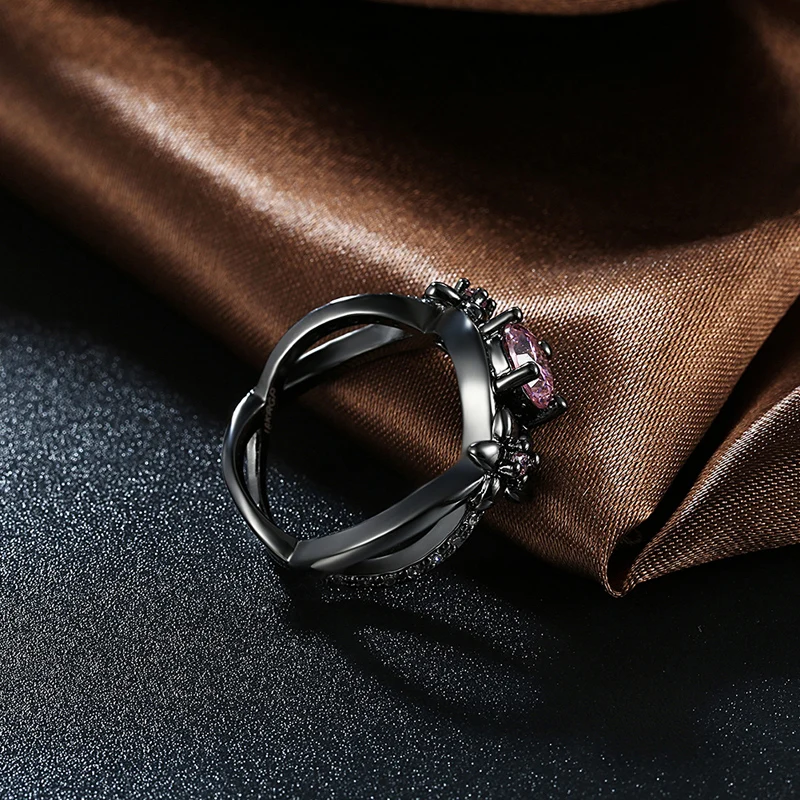 JEXXI New Black Gold Color Ring Pink Cubic Zirconia Flower Ring For Women Double Cross Design Jewelry Wholesale