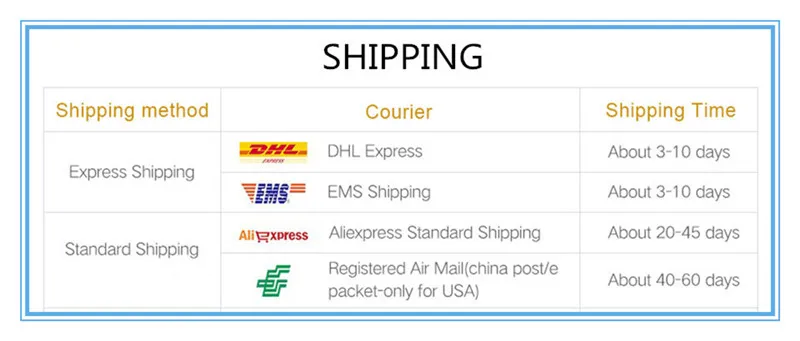 Packages from our warehouse in China will be shipped by ePacket or EMS depending on the weight and size of the product. Packages shipped from our US warehouse are shipped through USPS.