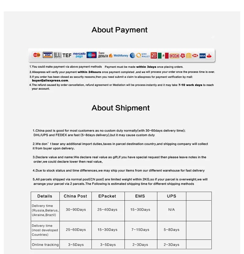 Packages from our warehouse in China will be shipped by ePacket or EMS depending on the weight and size of the product. Packages shipped from our US warehouse are shipped through USPS.