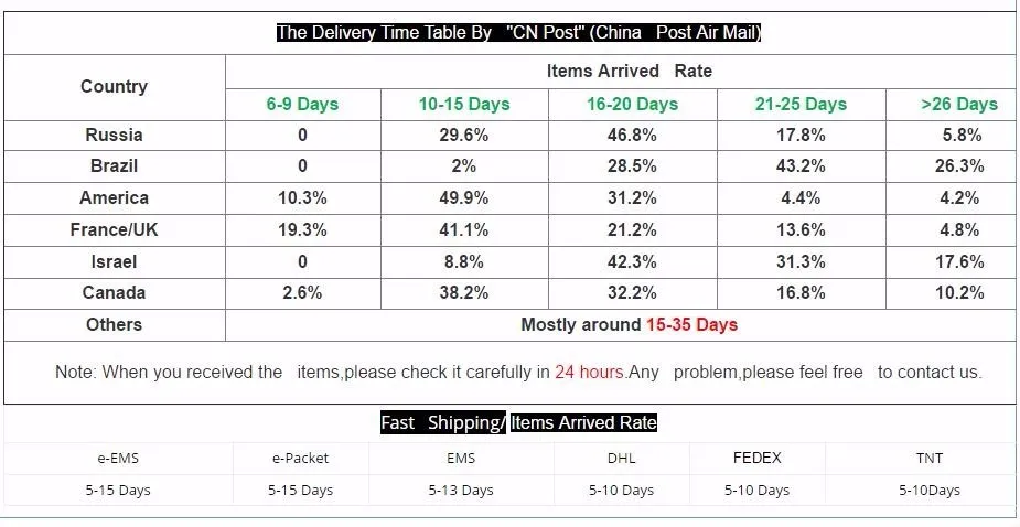 Packages from our warehouse in China will be shipped by ePacket or EMS depending on the weight and size of the product. Packages shipped from our US warehouse are shipped through USPS.