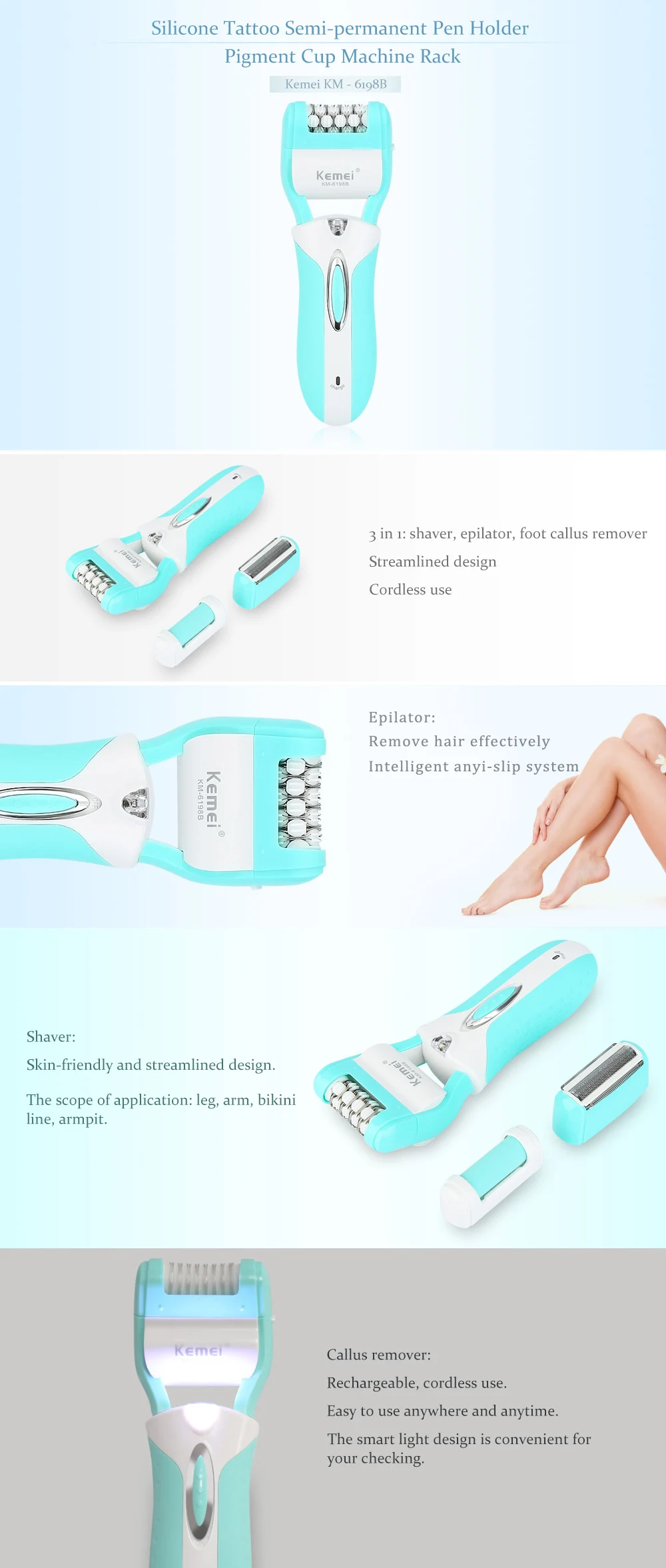 Kemei – 6198B 3 In 1 Rechargeable Lady Epilator Foot Callus Shaver Tool Women Epilator Shaver Dead Skin Callus Remover