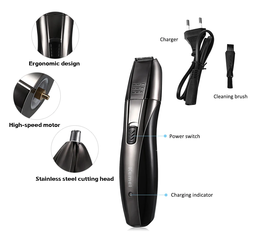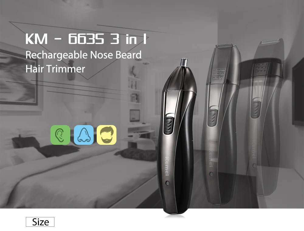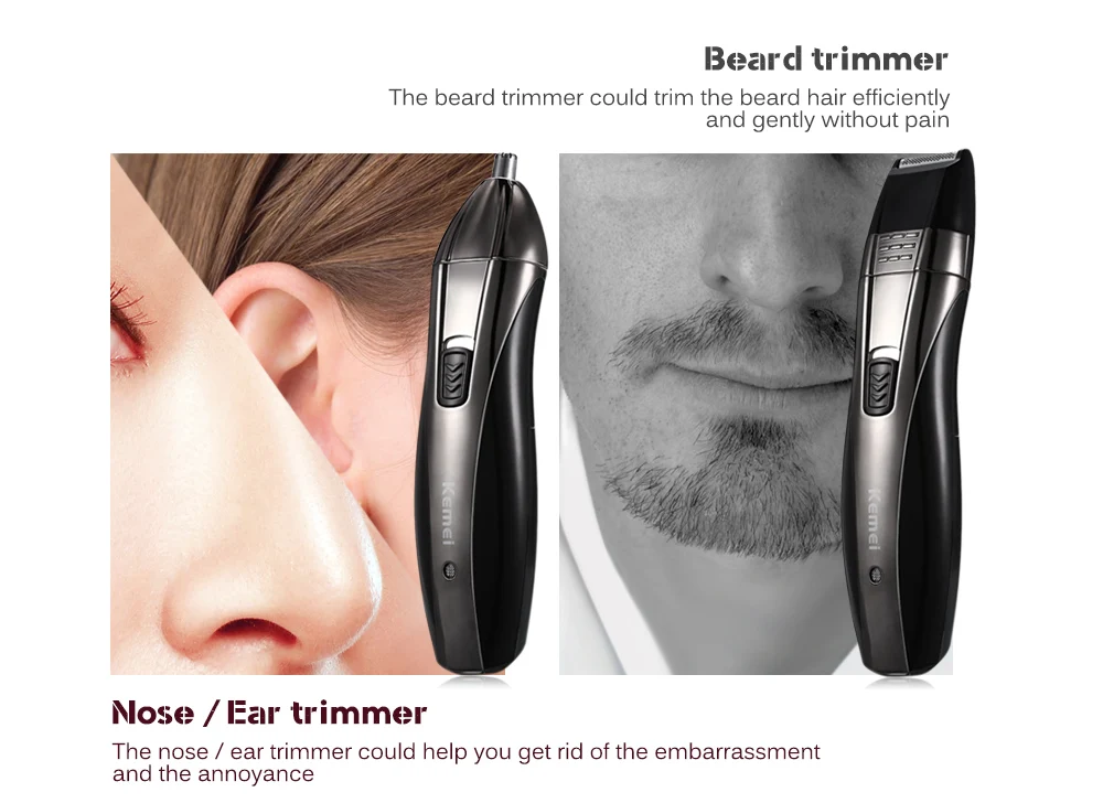 The KM – 6635 Hair Trimmer is a 3 in 1 multi-functional electric tool for trimming beard, sideburns, nose and also with ear hair.