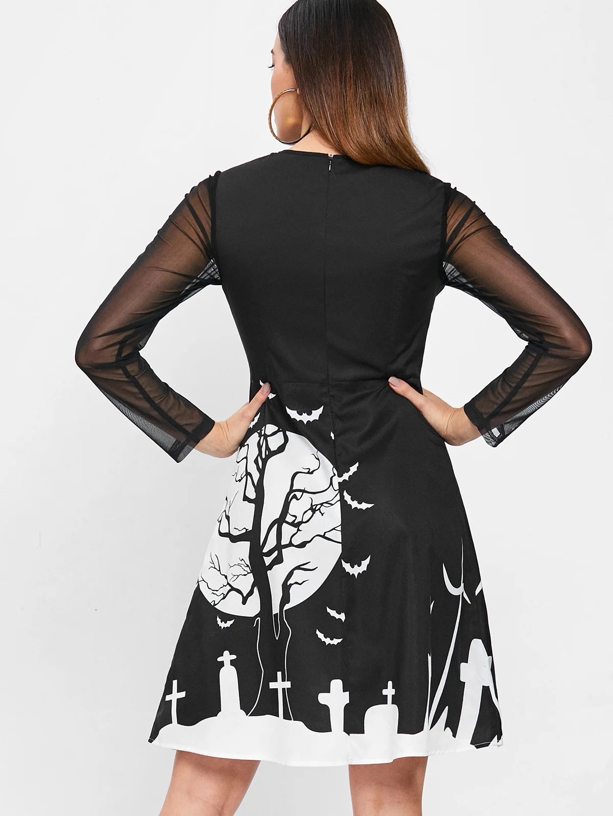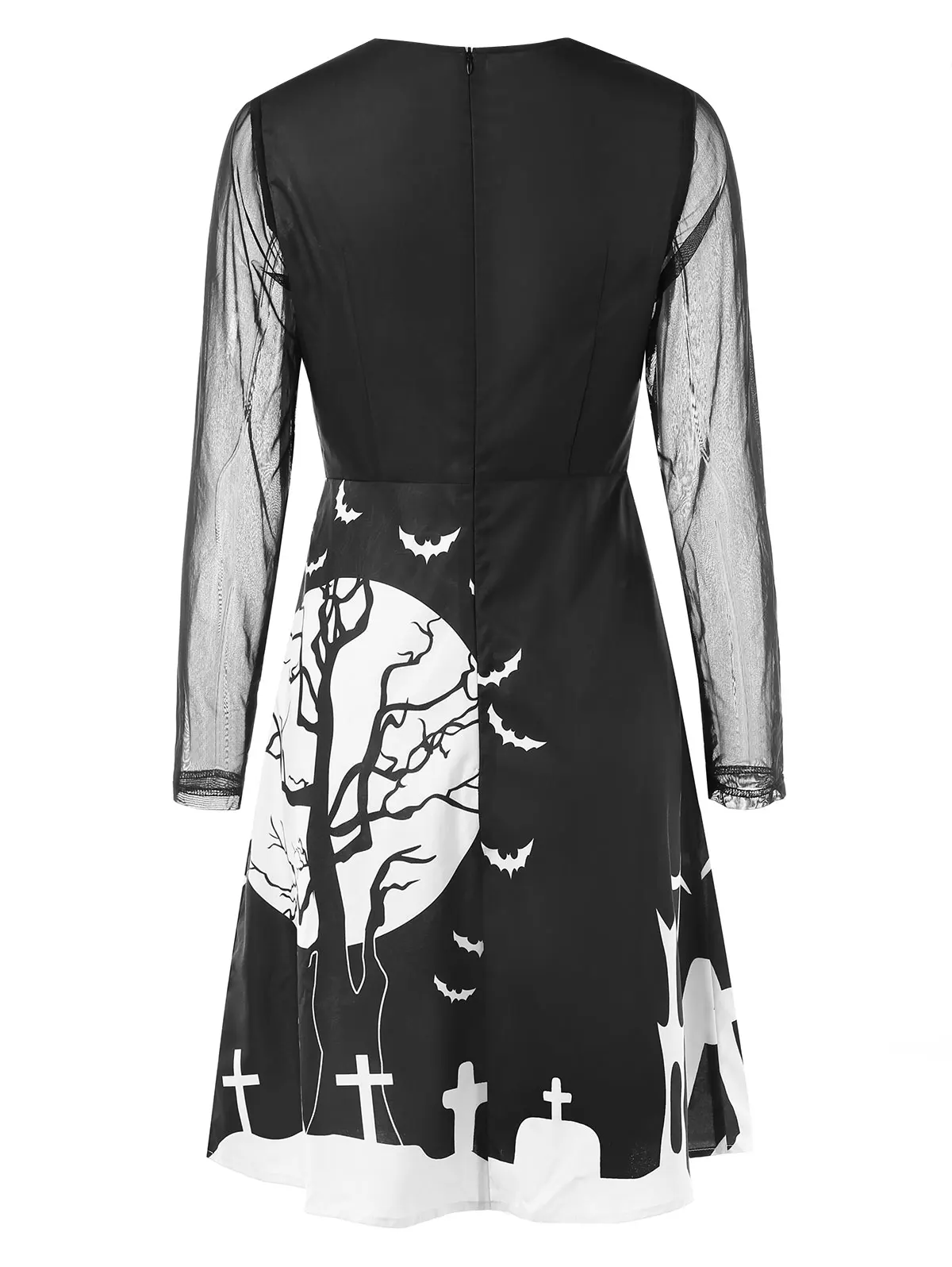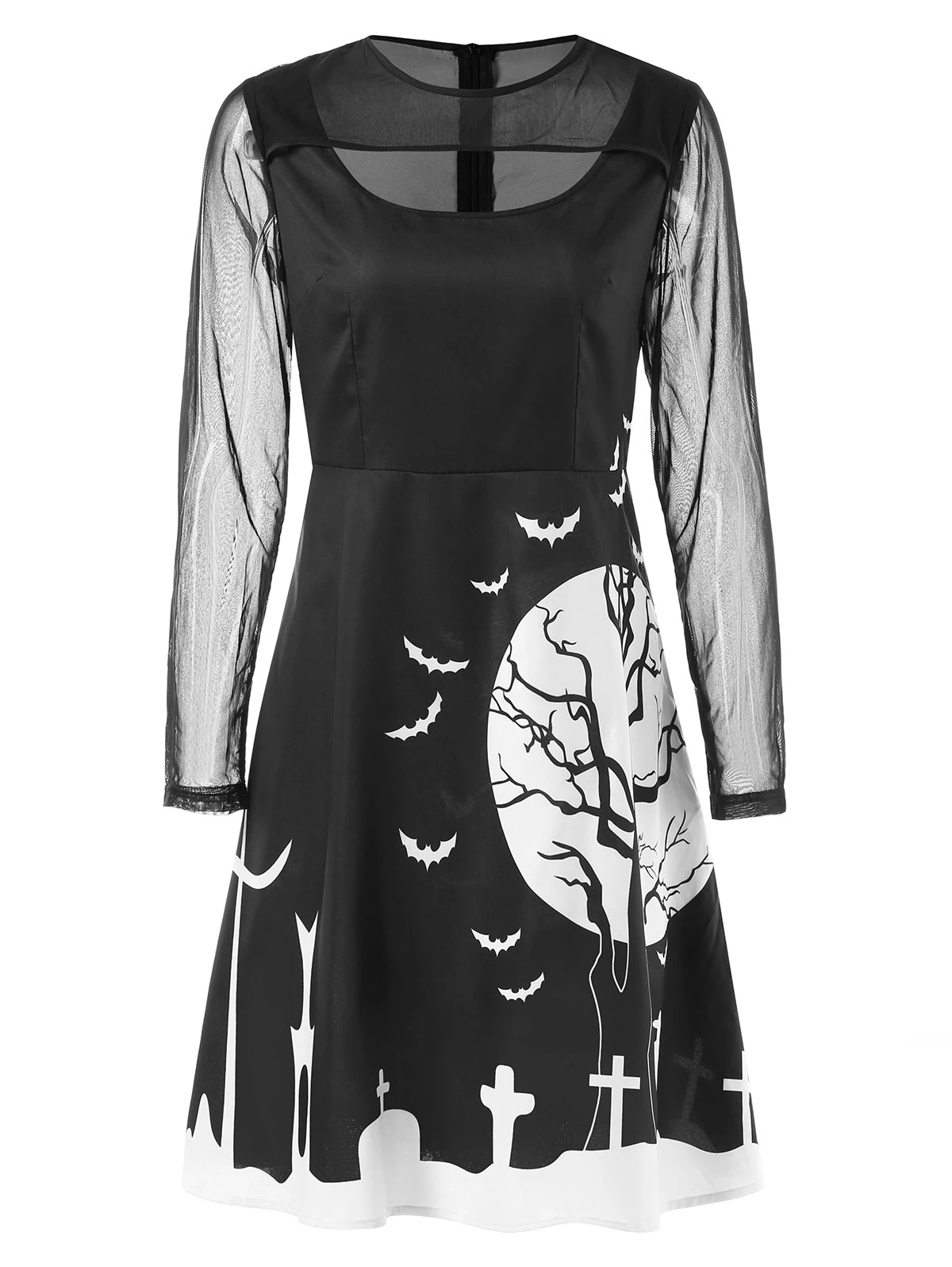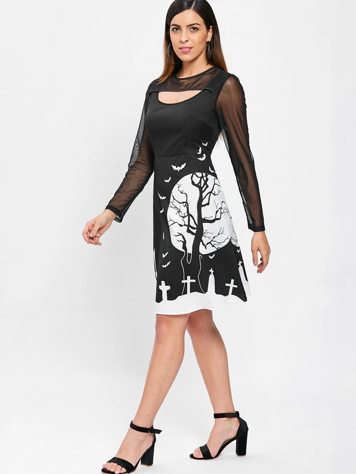 Kenancy Cut Out Full Sleeve Halloween Print Dress Mesh Panel Knee Length Dress A Line High Waist