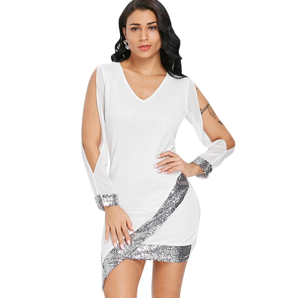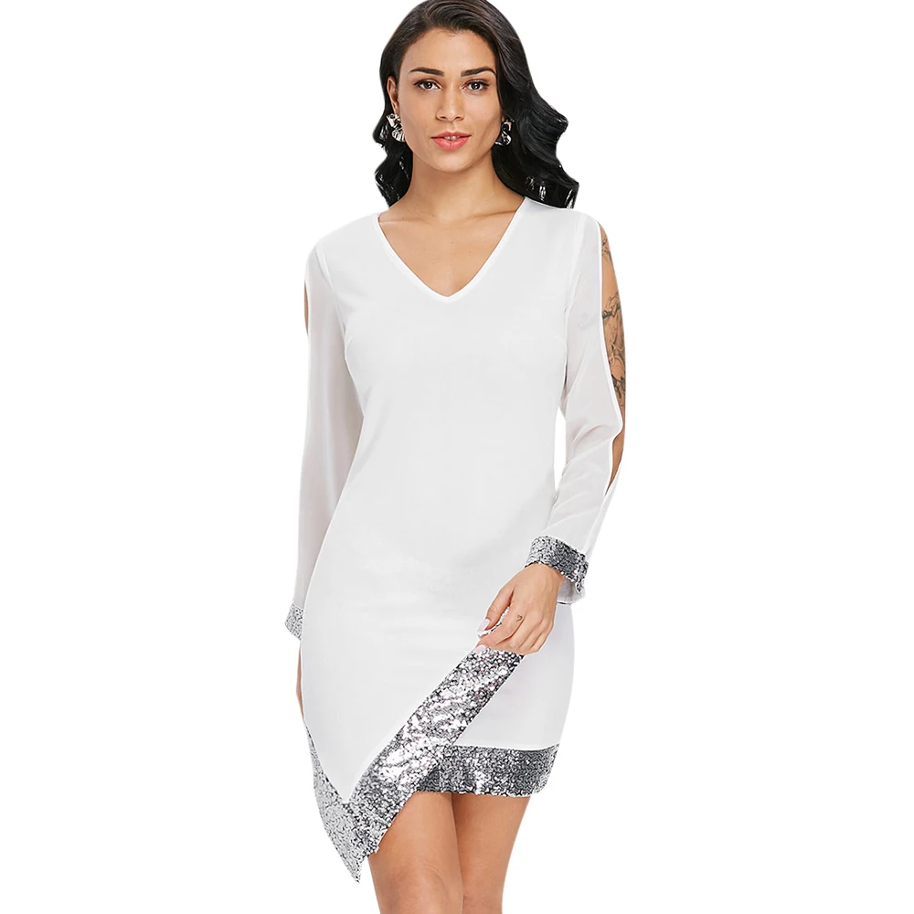 This gorgeous dress is an understated way to rock a party look! Dazzling sequins hemline embellishment highlights this asymmetrical dress. This bodycon dress features a long sleeve with ripped design, V-neckline. Dress it up with high heels for your wonderful party trip.