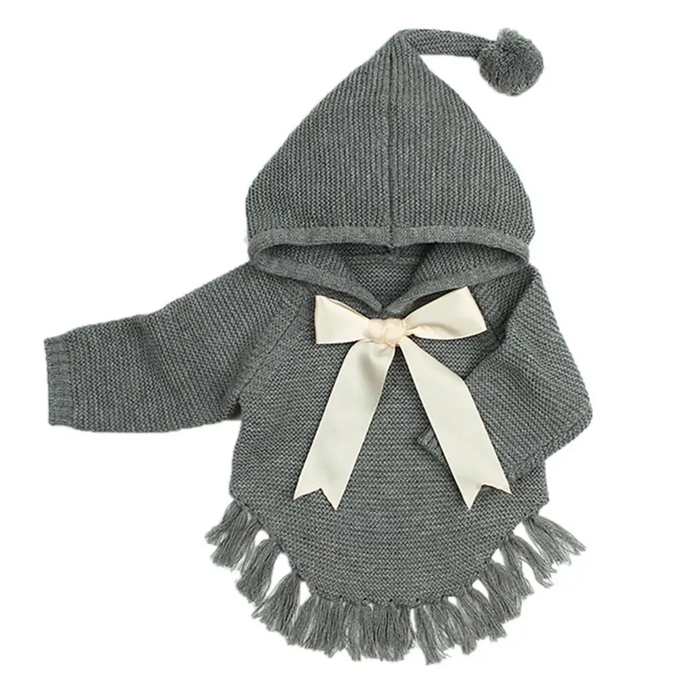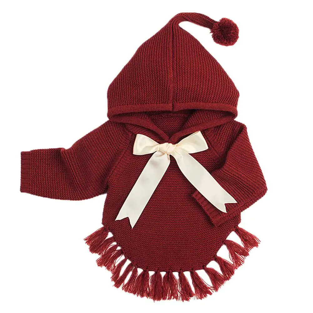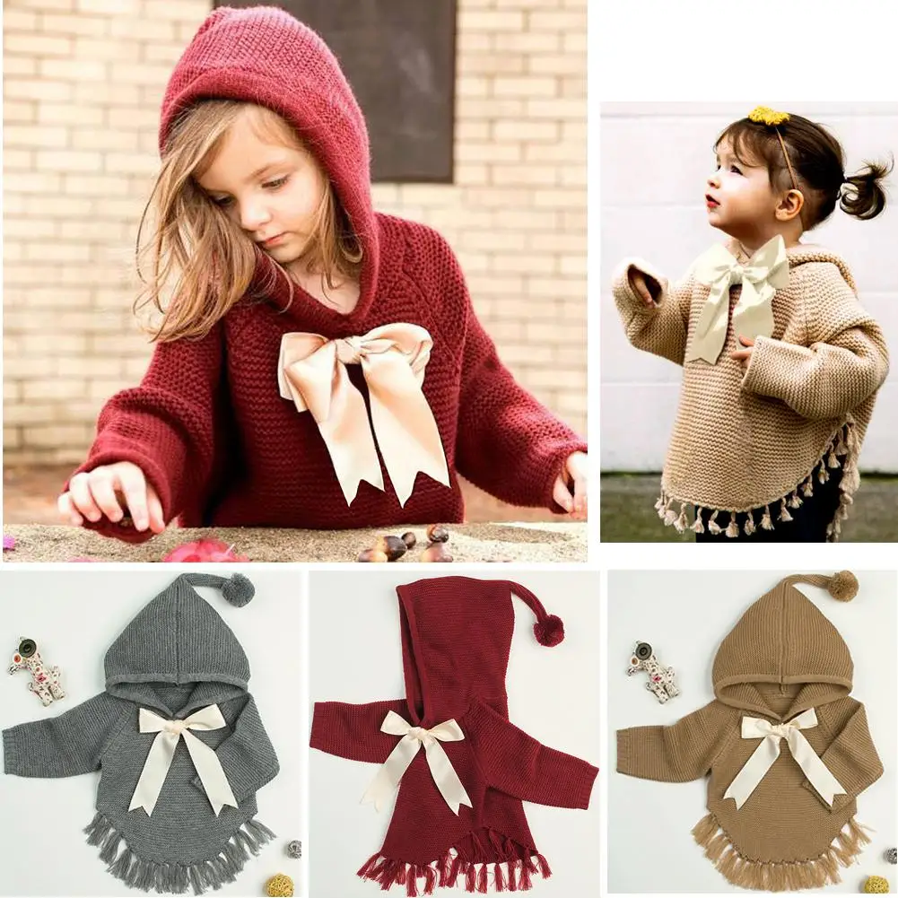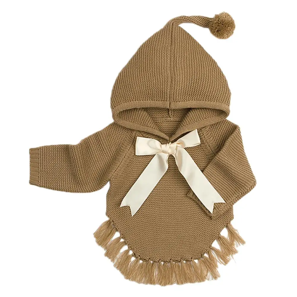Kidlove Babygirls Cute Bowknot Sweaters Pullover Long Sleeve Tassels Solid Hooded Sweaters Irregular Hem Outerwear Knitwear SAN0