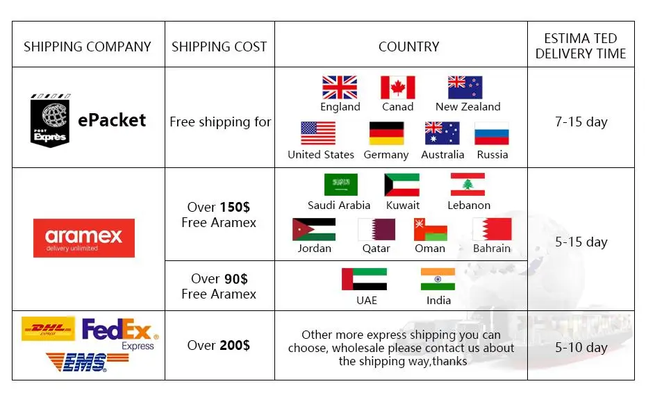 Packages from our warehouse in China will be shipped by ePacket or EMS depending on the weight and size of the product. Packages shipped from our US warehouse are shipped through USPS.