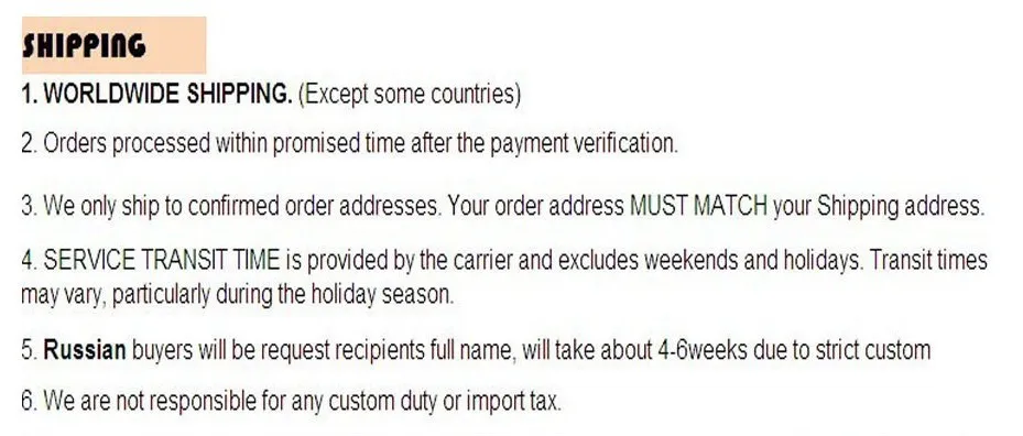 We are not responsible for any custom fees once the items have shipped. By purchasing our products, you consent that one or more packages may be shipped to you and may get custom fees when they arrive in your country.
