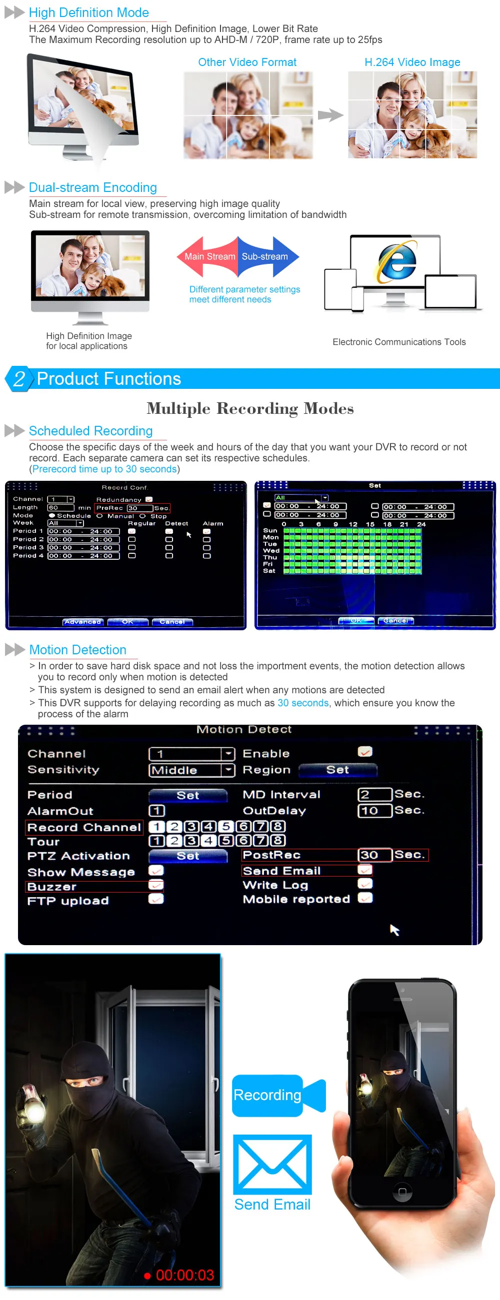 * Multi-stream recording resolution and Multiple backup modes.