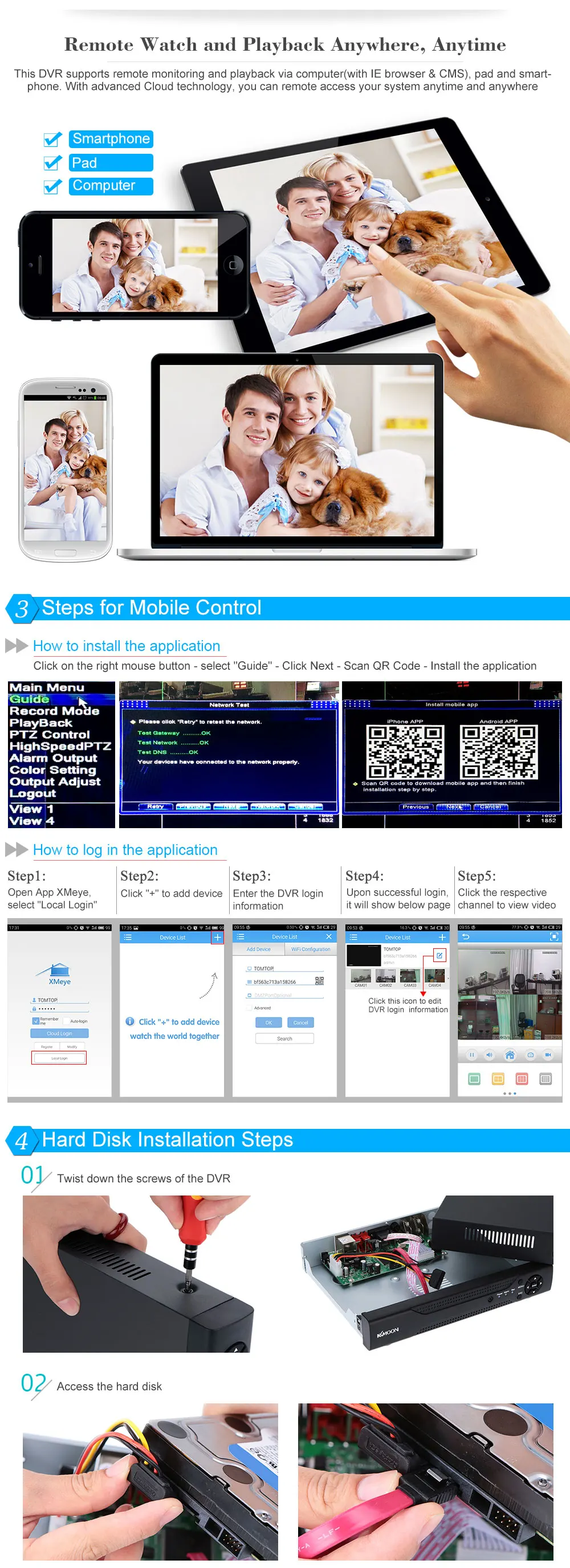 This AHD DVR combines the function of DVR/HVR/NVR, supports 4-ch playback(ChannelType is AHDL/960H) and multi-mode input including HD-720P, analog, HD-720P + analog, which provide a great variety of choices for security monitoring and bring you a safer monitoring system. Meanwhile this AHD DVR provides digital zoom, which allows you to get a closer view of record clips, it maximum supports 3TB 3.5″ harddisk(Hard Drive not Included). Finally, you can choose scheduled recording, set motion detection or watch the video on your computer and phone. Easy installation, easy operation.