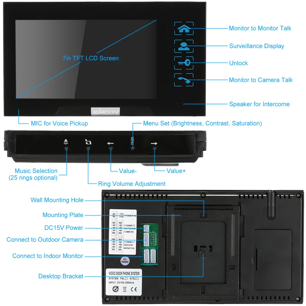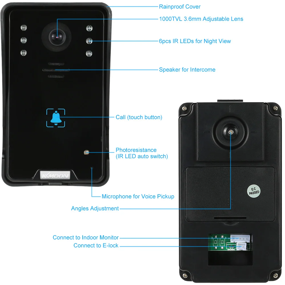 This video door phone features 7in LCD monitor with touch button, including one 1000TVL outdoor camera and two indoor monitor, which combines functions of visual intercom, real-time surveillance, remote unlock, rainproof and night vision, which is widely used in villas, apartments, houses, hotels, offices, public buildings and so on.