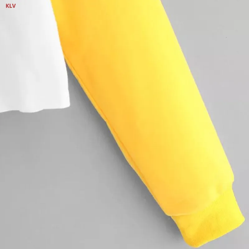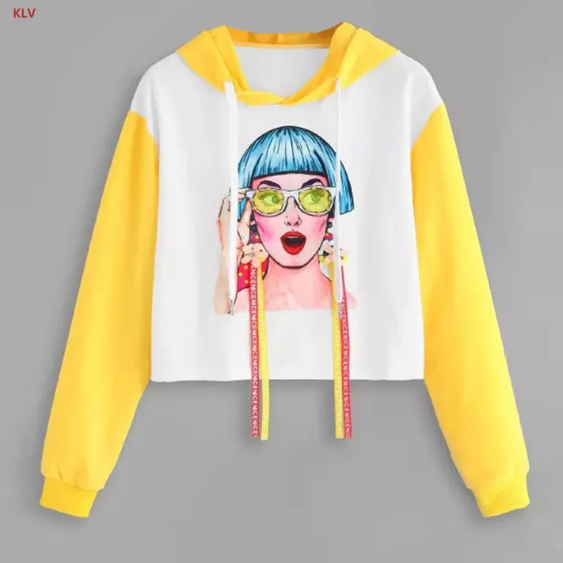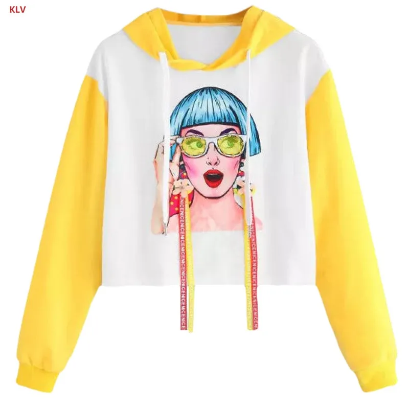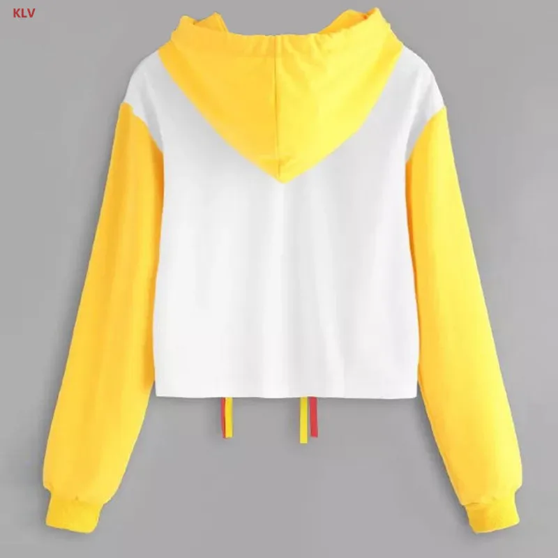 KLV Womens Girl Appliques Sweatershirt Loose Cropped Hoodies Ribbons Color Block Top