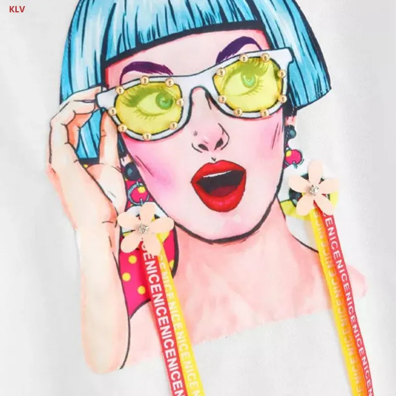 • Short hair girls pattern printed with appliques ribbons, self-tie drawstring front, loose fit.